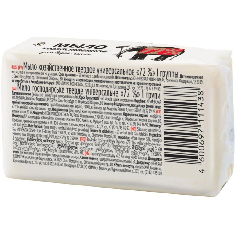 Мыло хозяйственное 72 % 180 г (36 штук в упаковке). Назначение: Предназначено для стирки белья и мытья твердых поверхностей. Мыло изготовлено на основе натуральных компонентов. Содержит глицерин. Дает обильную пену даже в холодной воде, отлично отстирывает загрязнения. Глицерин защищает кожу от потери естественной влаги, обеспечивает смягчение и увлажнение. Способ применения: Вспенить, легкими движениями нанести на ткань, постирать, хорошо промыть водой. Меры предосторожности: При попадании в глаза промыть водой. Состав: Натриевые соли жирных кислот растительных масел и животных жиров, вода, глицерин, триэтаноламин, ПЭГ - 400, динатриевая соль ЭДТА, лимонная кислота, натрий карбоксиметилцеллюлоза, бензойная кислота, натрия хлорид. Срок годности: 60 месяцев.