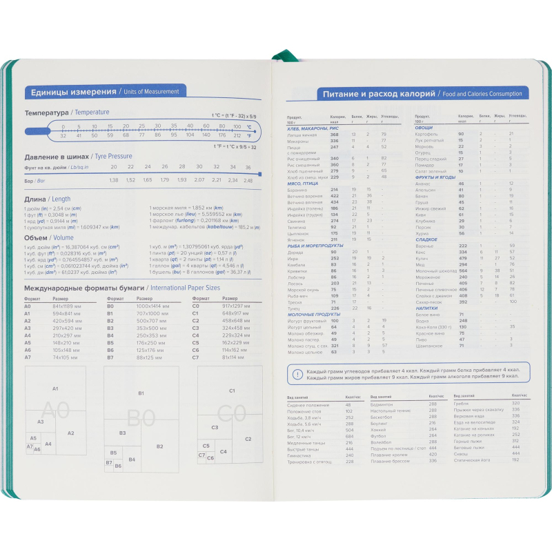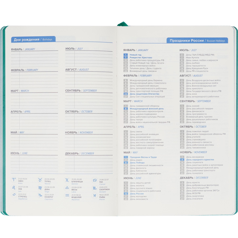 Ежедневник формата А5 недатированный, цвет бирюзовый 130x210 мм, ляссе бирюзового цвета, 272 страницы, блок в 2 краски, календарь на 2024-2027 гг. Мягкая обложка выполнена из искусственной кожи высокого качества эмоционального, яркого стиля. Блок: офсет 70 г/кв.м (линейка), бумага бежевого цвета. Содержит информационно-справочный блок - праздники России, единицы измерения, питание и расход калорий, товарный штрих-код производителя, телефоны первой необходимости, официальные сайты РФ. Нет петли под ручку.
