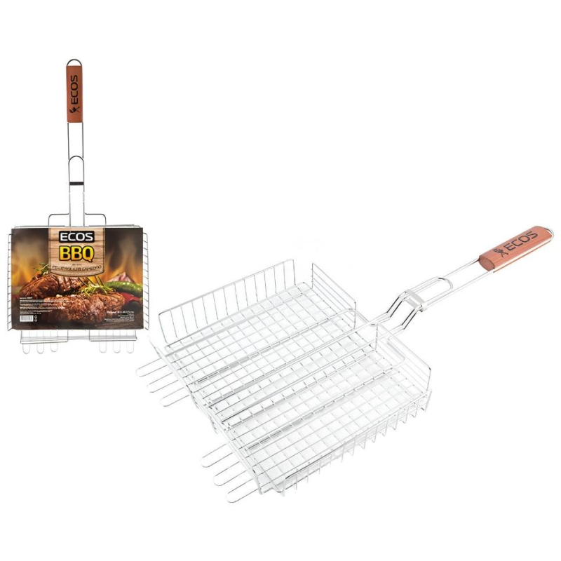 Решетка для барбекю глубокая Ecos RD-102D 31х24х5 см Глубокая и регулируемая по высоте решетка для барбекю поможет легко приготовить вкуснейшие блюда на открытом огне. Удобная деревянная ручка не нагревается при использовании и не скользит в руках. Благодаря тому, что решетка переворачивает все содержимое одним движением, значительно экономится время при готовке. Удобный зажим прочно закрепит продукты на решетке, будь то мясо, овощи или рыба. Легко моется и прослужит долгое время. Диаметр проволоки: 4,5 мм, 2,8 мм, 1,8 мм. Материал: решетка - хромированная сталь, деревянная ручка. Размер: 31х24х5 см, общая длина 65 см.