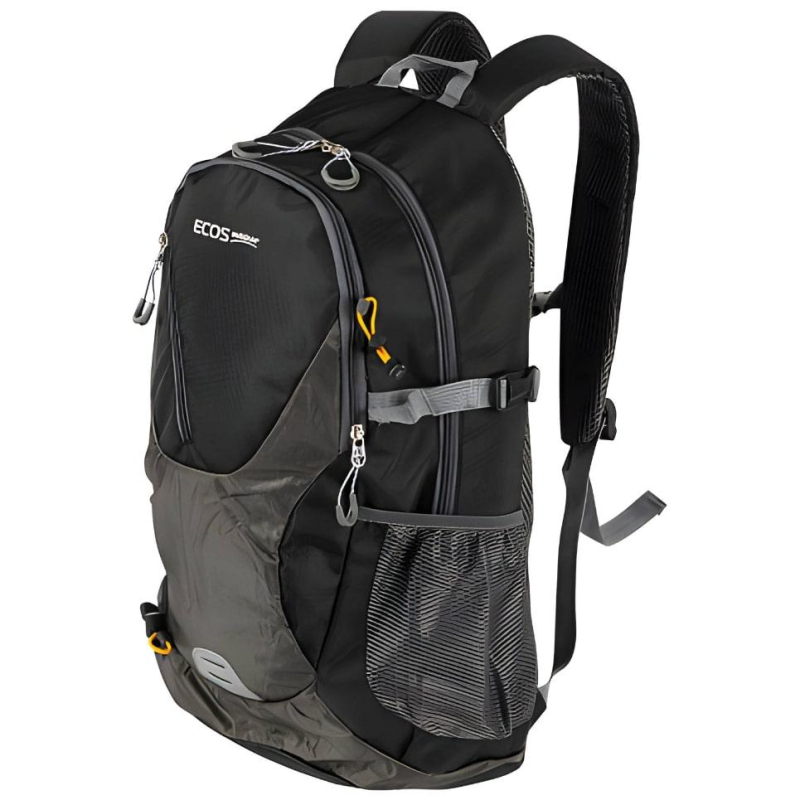Рюкзак Ecos Scout 510x310x200 мм черный Особенности: - 2 пластмассовые петли, 2 стяжки с защелками Фастекс. - Регулируемый нагрудный ремень с зстежкой Фастекс. - Вентилируемые сетчатые лямки (регулируются). - Мягкие накладки под спину из сетчатого вентилируемого материала. - 2 крепления для треккинговых палок. Параметры: Объем: 35 л. Размер: 51x31x20 см. Материал верха: Оксфорд 420D. Материалы: полиэстер, резина, пластмасса, металл. Основное отделение с двусторонней молнией: 50 см глубиной, ширина 30 см , внутренний карман 33 см глубина. Дополонительное отделение 35 см глубиной. 2 боковых сетчатых открытых кармана: 14 см глубиной, наружный карман на молнии.