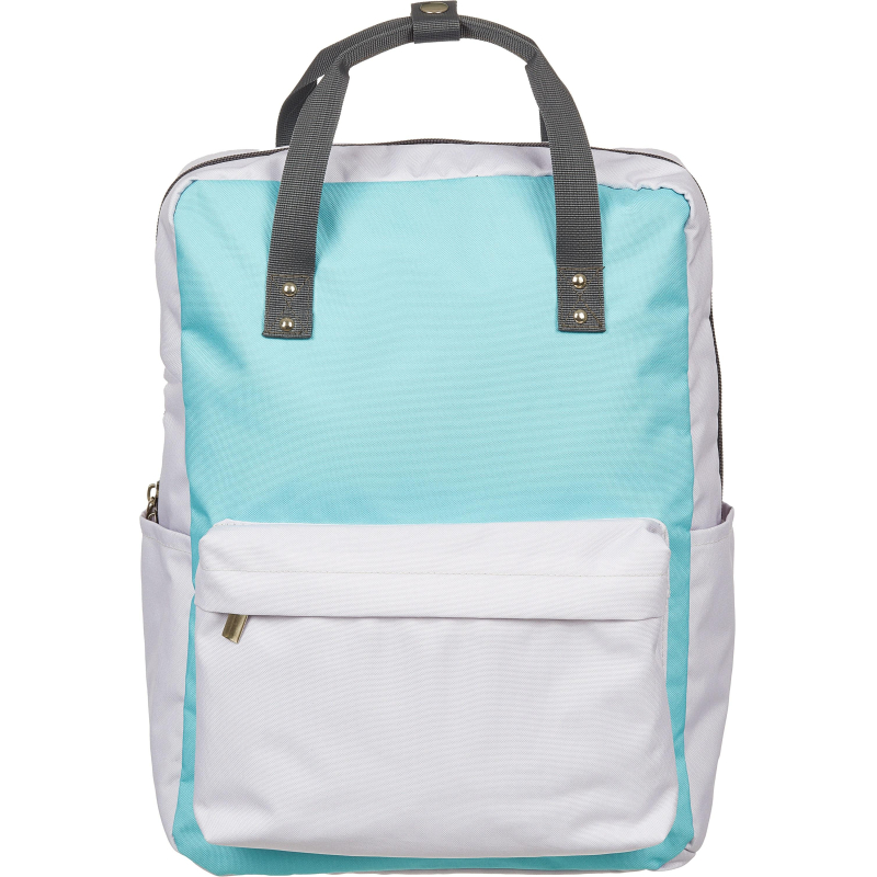 Рюкзак молодежный. Одно основное отделение на молнии. На лицевой стороне имеется накладной карман на молнии. Два боковых кармана. Внутри рюкзак отделан подкладочной тканью и имеет открытый внутренний карман. Мягкая уплотненная спинка, уплотненные задние лямки. Сверху две ручки, соединящиеся кнопкой, для ношения в руке. Размер 370x280x130 мм. Вес изделия: 400 г. Однотонный комбинированный цвет мятный с бежевым.