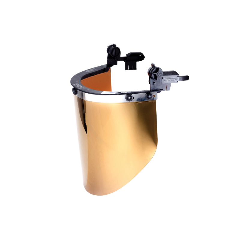Щиток защитный от УФ излучения, от царапин РОСОМЗ КБТМ Визион Termo с креплением на каску (04351) Щиток с креплением на каске для работ у доменных, сталеплавильных и других промышленных печей, для защиты от слепящей яркости видимого света, ИК-излучения и высокой температуры. Экран из ударопрочного и термостойкого поликарбоната со светоотражающим покрытием из золота от ИК-излучения. Защита от высокоскоростных летящих частиц с высокоэнергетическим ударом (190 м/с). Универсальное накасочное крепление Partner универсальные адаптеры на все каски РОСОМЗ. Имеется защиты от УФ-излучение, от царапин, а так же от кислот и щелочей. Диапазон рабочих температур от -20 до +55 градусов по Цельсию. Размер щитка - 240x395 мм. Вес - 272 г.