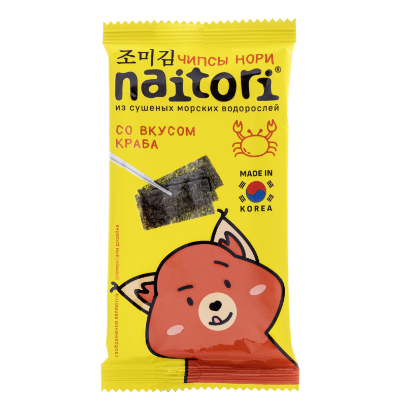 Чипсы нори из сушеных морских водорослей с оливковым маслом. 100% натуральный продукт. С морской солью. Содержит йод. Низко-калорийные вегетарианский продукт. Сушеная пищевая рыбная продукция из обжаренных морских водорослей со вкусом краба. Состав: морские водоросли, кукурузное масло, соль, крабовый порошок, кукурузный крахмал. Хранить при t от -10°С до + 25°С при относительной влажности не более 70%, избегать попадания прямых солнечных лучей. Срок годности 18 месяцев.