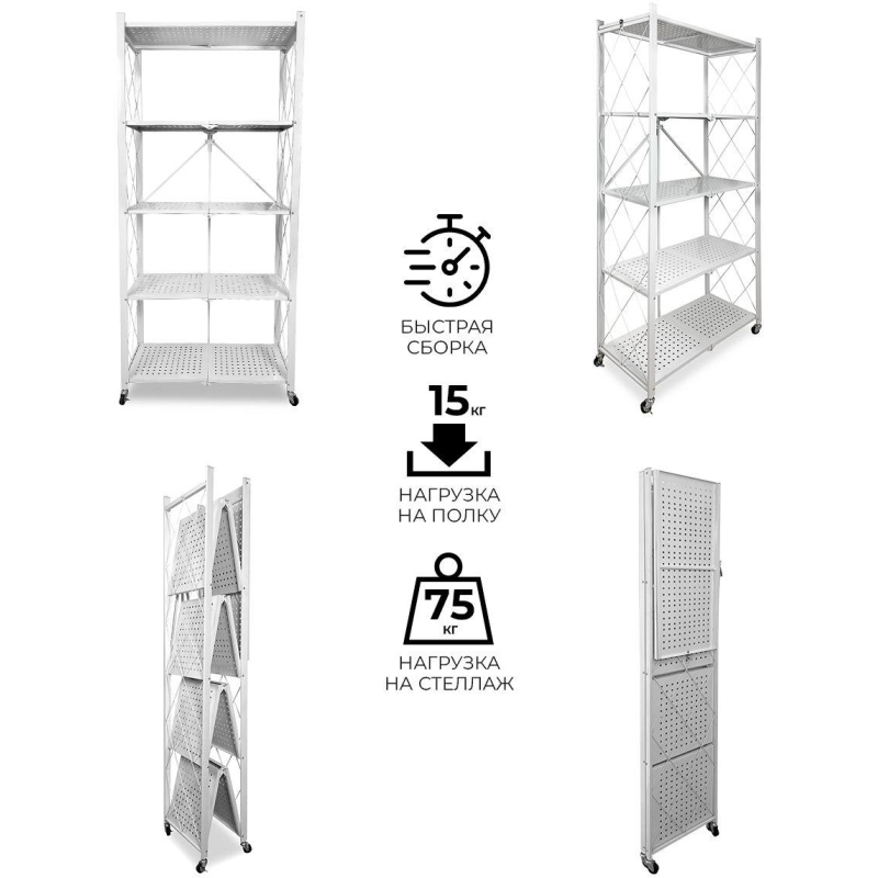 Металлический стеллаж отличается необычной конструкцией. Всего несколькими движениями его можно сложить до компактного состояния за 15 секунд. Для удобства перемещения у стеллажа имеются колеса. Для подготовки к эксплуатации не требуется утомительной сборки - необходимо только достать стеллаж из коробки, разложить и прикрутить колеса к ножкам стеллажа. На двух колесах имеется стопорный механизм. Стеллаж универсального применения - может использоваться как стеллаж для рассады, стеллаж для домашнего офиса, стеллаж для ванной, стеллаж для дачи, стеллаж для балкона, стеллаж для домашней мастерской, стеллаж для сада, этажерка для книг, этажерка для кухни и для многих других задач хранения. Будет удобен при транспортировке в автомобиле в сложенном виде. Подходит для выездных мероприятий и выставок. Прекрасно вписывается в современный интерьер помещения. Изображения товаров на сайте не могут гарантировать точную цветопередачу.