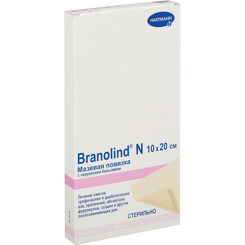 Мазевые повязки Бранолинд Н выпускаются в виде хлопковой крупноячеистой ткани размером 10x20, которая пропитана специальным мазевым составом. Натуральная ткань с крупными ячейками хорошо пропускает воздух и раневое отделяемое (экссудат), не мешая его оттоку от пораженных участков кожи. Ранозаживляющая повязка Бранолинд Н восстанавливает кожные покровы на тканевом уровне, предотвращая развитие вторичной инфекции. Перуанский бальзам, который является основным компонентом мазевого состава, содержит бензойную и коричную кислоты, ванилин и т.д., благодаря которым обладает антисептическим, антибактериальным и противовоспалительным свойствами. Вспомогательные компоненты мази: вазелин, глицерин, очищенный жир, триглицириды среднего звена. Мазевая повязка 10x20 предотвращает появление отеков, шрамов и рубцов. Когда необходимо использовать Бранолинд Н: язвы и пролежни; порезы, ссадины; рваные раны, ушибы; различные виды ожогов; состояния после фимозных операций; раны после пересадки кожи. Высокая эффективность этого средства замечается не только при терапии поверхностных, но и при лечении глубоких ран. Мазевая масса состоит из: Перуанский бальзам - 100 млг/2,0 г мазевой массы; Белый вазелин; Цетомакрогол 1000; Глицерина моностеарат - 40-50%; Жир гидрогенизированный; Триглицериды среднего звена.