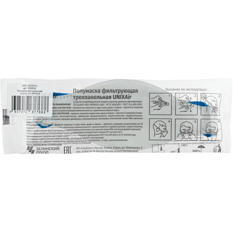 Респиратор Unix Air 211 противоаэрозольный без клапана FFP1 R D. Защита от аэрозолей и различных видов пыли (минеральной, металлической, животной, растительной, синтетических моющих средств и др.). Эффективность защиты от аэрозолей: FFP1 - низкая эффективность: нетоксичные аэрозоли в виде пыли, дыма и тумана до 4-х ПДК (пищевая, деревообрабатывающая промышленность, строительная отрасль и др.). Преимущества: - надежное прилегание за счет складной 3-х панельной конструкции; - способ фильтрации аэрозолей - электростатический; - совместимость с защитными очками, щитками, касками; - один универсальный размер; - многоразовое использование (знак R); - устойчивость к запылению (знак D). Полумаска состоит из складного 3-х панельного корпуса с удлиненным пластичным носовым зажимом и мягкой потовпитывающей подкладкой из вспененного материала в области переносицы, двух эластичных тесьм оголовья для закрепления полумаски на лице. Соответствует стандартам ТР ТС 019/2011, ГОСТ 12.4.294-2015.