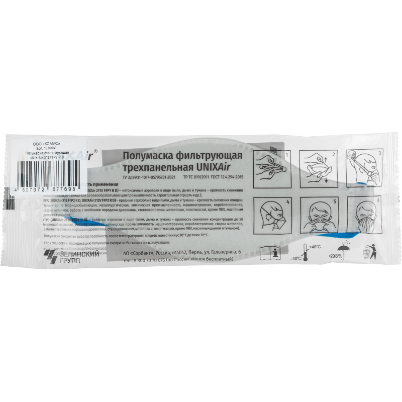 Респиратор Unix Air 212 противоаэрозольный без клапана FFP2 R D. Защита от аэрозолей и различных видов пыли (минеральной, металлической, животной, растительной, синтетических моющих средств и др.). Эффективность защиты от аэрозолей: FFP2 - средняя эффективность: вредные аэрозоли в виде пыли, дыма и тумана до 12 ПДК (горнодобывающая, металлургическая, химическая промышленность, машиностроение, кораблестроение, сварка металлов, работа с хвойными породами древесины, стекловолокном, металлами, пластмассой, кроме ПВХ, масляным дымом и туманом). Преимущества: - надежное прилегание за счет складной 3-х панельной конструкции; - способ фильтрации аэрозолей - электростатический; - совместимость с защитными очками, щитками, касками; - один универсальный размер; - многоразовое использование (знак R); - устойчивость к запылению (знак D). Полумаска состоит из складного 3-х панельного корпуса с удлиненным пластичным носовым зажимом и мягкой потовпитывающей подкладкой из вспененного материала в области переносицы, двух эластичных тесьм оголовья для закрепления полумаски на лице. Соответствует стандартам ТР ТС 019/2011, ГОСТ 12.4.294-2015.