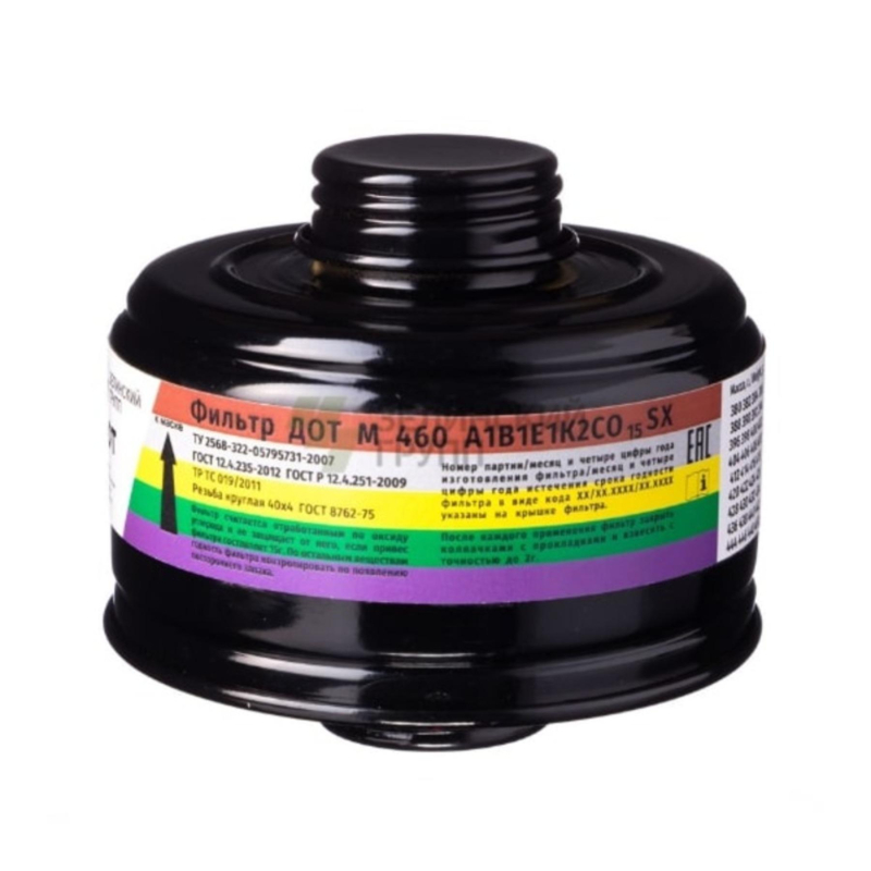 Фильтр противогазовый ДОТ М 460 А1В1Е1К2СО15SX Противогазовый фильтр в металлическом корпусе (искробезопасное исполнение) обеспечивает защиту от органических газов и паров, неорганических газов и паров, кислых газов и паров, аммиака и его органических производных, монооксида углерода. Соединительная часть (горловина): резьба круглая 40х4 (ГОСТ 8762-75). Класс защиты по вредным веществам: - по органическим газам и парам - 1 (низкой эффективности); - по неорганическим газам и парам - 1 (низкой эффективности); - по кислым газам и парам кислот - 1 (низкой эффективности); - по аммиаку и его производным - 2 (средней эффективности); По монооксиду углерода - до достижения привеса фильтра 15 гр. Время защитного действия по тест-веществам в условиях испытаний согласно ГОСТ 12.4.235-2019. Гарантийные срок хранения - не менее 3,5 лет. Срок годности: не более гарантийного срока хранения. Цветовое обозначение фильтра: серый, желтый, зеленый, фиолетовый.