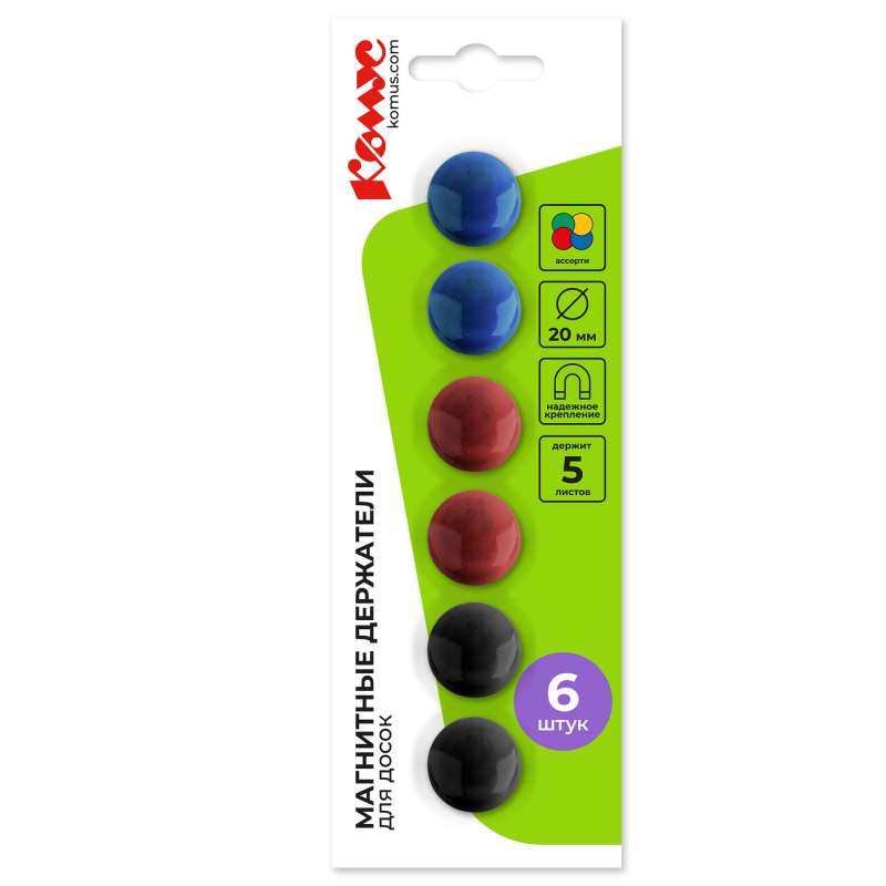 Магнитные держатели для досок марки Комус - это надежные и удобные аксессуары для фиксирования листов бумаги к магнитной поверхности белых досок, флипчартов и других подобных поверхностей. Они прочно держат листы бумаги на месте, не позволяя им соскальзывать или падать. В упаковке поставляется 6 магнитных держателей трех цветов по 2 штуки каждого цвета (синий, красный, черный) для наглядности работы с иформацией. Материал: качественный пластик, сталь. Упаковка в виде блистера компактна и практична. Магниты имеют удобный диаметр 20 мм, что позволяет не загораживать информацию на бумаге и обеспечивает компактное хранение и расположение на доске или другой рабочей поверхности.