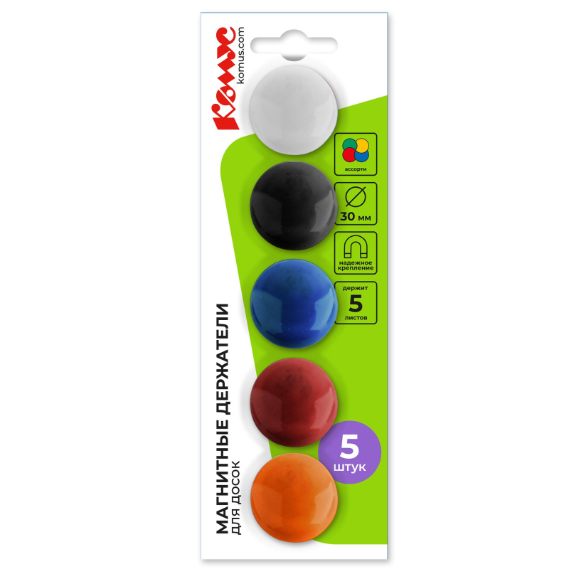 Магнитные держатели для досок марки Комус - это надежные и удобные аксессуары для фиксирования листов бумаги к магнитной поверхности белых досок, флипчартов и других подобных поверхностей. Они прочно держат листы бумаги на месте, не позволяя им соскальзывать или падать. В упаковке поставляется 5 магнитных держателей разных цветов (белый, синий, красный, черный, оранжевый) для наглядности работы с иформацией. Материал: качественный пластик, сталь. Упаковка в виде блистера компактна и практична. Магниты имеют удобный диаметр 30 мм, что позволяет не загораживать информацию на бумаге и обеспечивает компактное хранение и расположение на доске или другой рабочей поверхности.