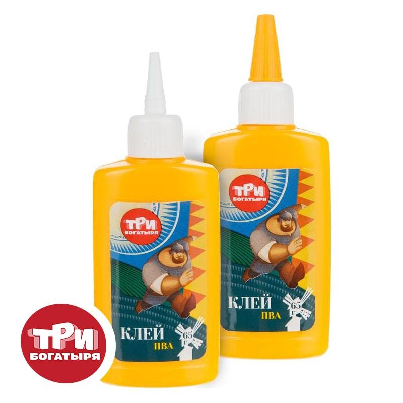 Клей ПВА 65 г Комус Три Богатыря школьный предназначен для склеивания бумаги, картона, дерева, фотобумаги. Идеален для использования в канцелярских целях - незаменим в делопроизводстве. Рекомендуется использовать для творческих детских работ по бумаге и картону. Хорошо смывается водой. Перед применением клей необходимо перемешать и, очистив склеиваемые поверхности от загрязнений и просушив их, нанести клей, соединить и прижать. Склеиваемое соединение надо оставить в сжатом состоянии не менее чем на 2 часа. Время полного высыхания при температуре 20 С и относительной влажности воздуха 65% - 24 часа. Клей морозостойкий и не теряет своих свойств после 4 циклов замораживания-размораживания при температуре -40 градусов. Состав не токсичен и безопасен при применении по назначению. Крышка-дозатор обеспечивает герметичность в закрытом состоянии и равномерность нанесения клеевого состава. Габариты: 120x25x45 мм.