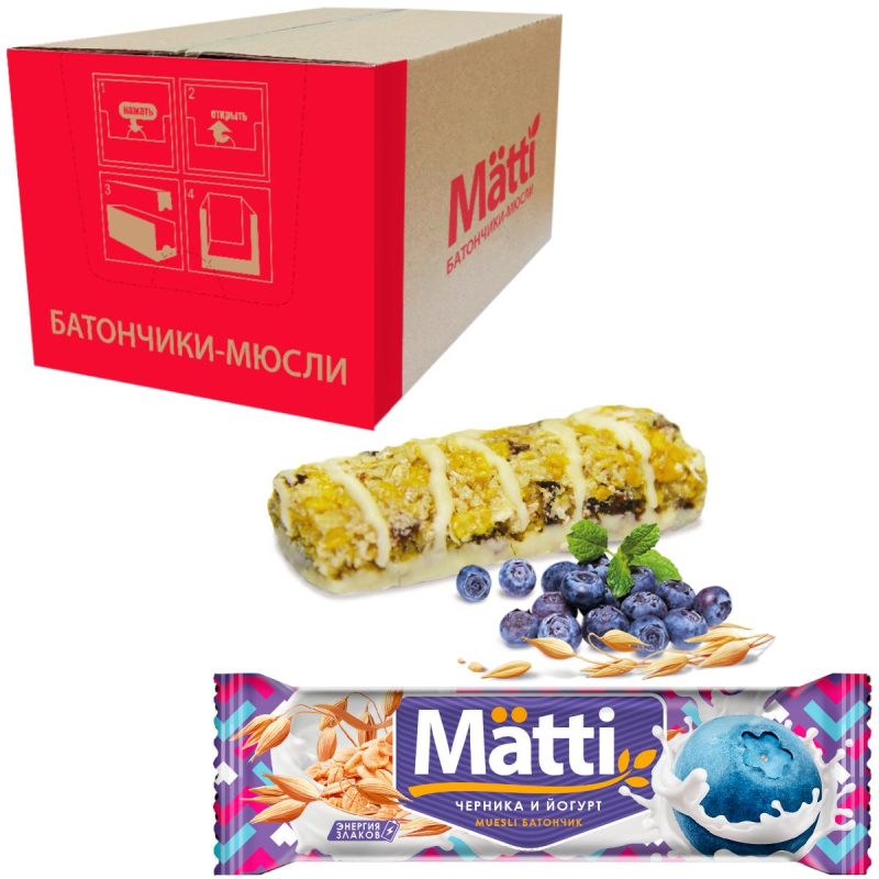 Батончик-мюсли Matti Черника и йогурт - злаковый батончик с добавление воздушного риса, ягод и белой глазури. Хрустящий батончик зарядит энергией злаков и наполнит день ярким вкусом. Состав: смесь злаковая (рис воздушный шарики (мука рисовая, мука пшеничная, сахар, соль), хлопья овсяные, зернышки рисовые (мука (крупа) рисовая, мука пшеничная, сахар, соль), хлопья кукурузные дробленые (крупа кукурузная, сахар, соль)), сироп глюкозно - фруктозный, глазурь белая (сахар, заменитель какао-масла лауринового типа (пальмоядровый стеарин, эмульгаторы: Е 492, соевый лецитин), сыворотка сухая молочная, эмульгатор соевый лецитин, ароматизатор), патока, смесь сушеных ягод (клюква, черника), масло растительное, эмульгатор - лецитин соевый, ароматизатор, регулятор кислотности - кислота лимонная, йогурт сухой обезжиренный. Может содержать следы арахиса, орехов. Пищевая ценность: белки - 4 г; жиры - 10 г; углеводы - 73 г. Энергетическая ценность: 400 ккал. Срок годности: 13 месяцев. Условия хранения: хранить в сухом месте при температуре не выше 25 С и относительной влажности воздуха не более 75 %. Вес: 576г (24 батончика по 24 г). Страна производства: Россия.