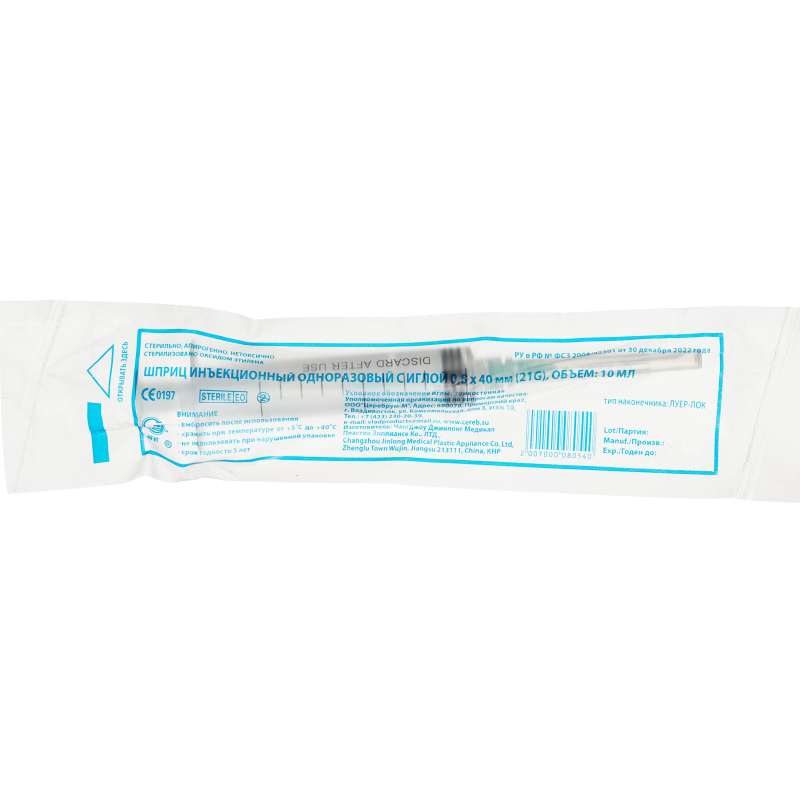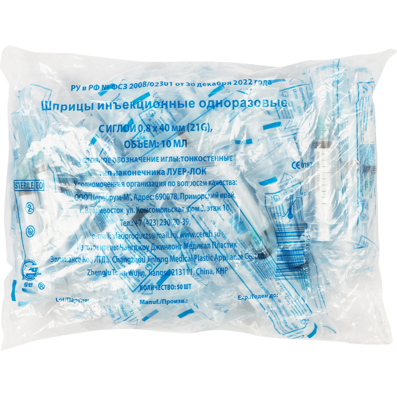 Шприц трехкомпонентный Джинлонг 10 мл 21G (0.8 x 40 мм, 50 штук в упаковке). Тип наконечника: Луер-Лок (Luer-Lock). Шприц имеет трехдетальную конструкцию - цилиндр, шток-поршень, манжета. Материалы шприца совместимы с жидкостями для инъекций. Детали шприца изготовлены из полипропилена медицинского назначения; манжета изготавливается из нетоксичного натурального каучука (медицинская резина), не содержащий латекс, что позволяет исключить проявление часто встречающейся латексной аллергии. Бесцветный прозрачный цилиндр и белый контрастный шток-поршень для лучшего визуального контроля лекарства при проведении процедуры. Игла 0,8 х 40мм (21Gх1?) производится из высококачественной нержавеющей аустенитной стали с трехгранной лазерной заточкой. Стерилизация: газовая, ЕО (этилен оксид). Срок годности - 5 лет. Материал упаковки: индивидуальная и групповая (полиэтилен), транспортная (картон).