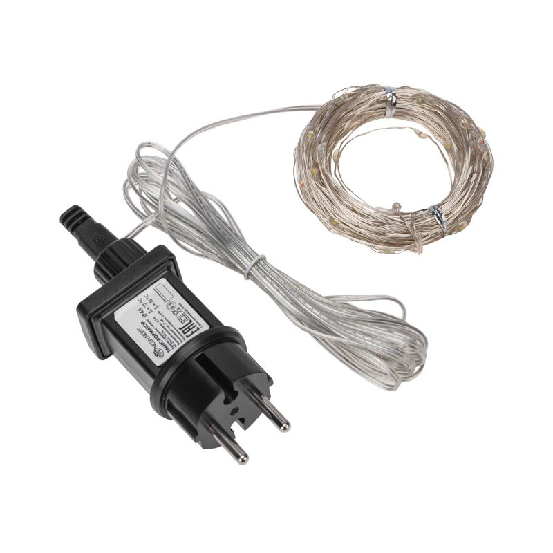 Светодиодная гирлянда "Роса" - прекрасный декоративный элемент, светящийся разными огоньками и создающий атмосферу праздника и уюта. Это отличный способ акцентировать внимание на отдельных предметах интерьера, создать неповторимый арт-объект или использовать в качестве дополнительной подсветки. Гирлянда может эффектно подчеркнуть красоту картины, вазы с цветами, статуэтки или украсить небольшую елочку. Данный вариант имеет большую длину и трансформатор для подключения в сеть с защитой IP44, что позволят использовать его и на улице. Гирлянда состоит из тонкого провода длиной 50 метров, с расположенными на нем 500 долговечными светодиодами в цвете мультиколор. Длина электрошнура 3 метра. Создайте атмосферу праздника с помощью светодиодной гирлянды "Роса"!