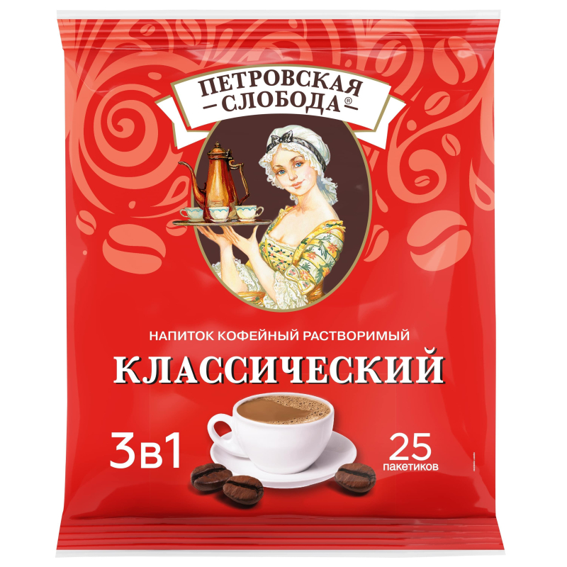 Кофейный напиток растворимый Петровская Слобода 3в1 25 пакетиков по 20 г - идеальное сочетание кофе, сахара и сливок. Индивидуальная упаковка кофейного напитка гарантирует простоту приготовления, где угодно: на работе, пока все стоят в очереди к автомату, в путешествии у костра, на перерыве между занятиями. Вам понадобится только доступ к горячей воде и кружка, а восхитительный вкус сделает вашу паузу еще приятнее. Кофейный напиток 'Петровская Слобода 3в1 Классический' - лучший способ поддержать хорошее настроение и насладиться великолепным вкусом.Состав: сахар, заменитель сливок на основе растительного жира (глюкозный сироп, растительный жир, обезжиренное сухое молоко, молочный белок, стабилизаторы (Е340ii, E452i), эмульгаторы (Е471, Е481), агент антислеживающий (Е551), регулятор кислотности (Е451i)), кофе натуральный растворимый.Вид кофе: растворимый.Способ приготовления: высыпать содержимое пакетика в чашку. Добавить 170 миллилитров горячей воды и размешать.Вес: 500 грамм. Количество пакетиков в упаковке: 25 штук.Тип упаковки: вакуумный пакет.Условия хранения: хранить в сухом месте.