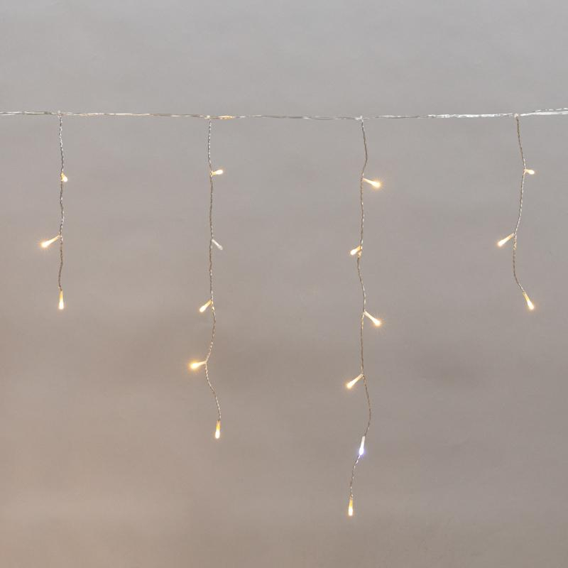 Светодиодная гирлянда Айсикл (Бахрома) представляет собой горизонтальный провод 5 м, на котором располагаются вертикальные нити разной длины от 30 до 60 см. Благодаря своей форме гирлянда оптимально подходит для оформления гардин, ниш, открытых проемов между комнатами, а также крыш, навесов, перил и других элементов зданий и ограждений. Степень защиты IP44 позволяет использовать гирлянду как на открытом воздухе под навесом, так и внутри помещений. На каждой нити располагаются светодиоды, создающие эффект сверкающих сосулек. Цвет свечения - теплый белый. Прозрачный провод изделия делает светящиеся линии более выразительными и образует гармоничную яркую композицию. Особенностью гирлянды является эффект мерцания, который добавляет динамики и создает магическую атмосферу.