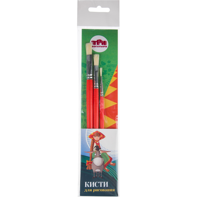 Кисть набор 3 шт Три Богатыря щетина плоская №4,8,10 Набор кистей Три Богатыря, включает в себя 3 кисти разного размера. Все кисти выполнены из щетины (плоские №4, №8, №10). Кисть из щетины обладает высокой упругостью, хорошо держит форму, долговечна и надежна. Кисть позволит прорисовывать детали и наносить крупные мазки и линии. Кисти имеют короткие деревянные ручки. Применяется для работы с маслом, акрилом. Поставляются в полиэтиленовом футляре с европодвесом.