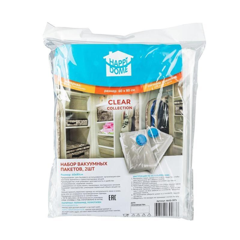 Вакуумные пакеты с клапаном изготовлены полиэтиленовой пленки обладающей стойкостью к механическим повреждениям. Вакуумные мешки позволяет экономить до 80% объема, защищают ваши вещи от влаги, пыли, насекомых и посторонних запахов. Используются для всех типов тканей, одежды, постельного белья, подушек и одеял. Замок и автоматический клапан надежно удерживают вакуум в течение всего срока службы. Подходит ко всем типам пылесосов. В набор входит: 2 пакета с клапаном. Размер 60x80 см.
