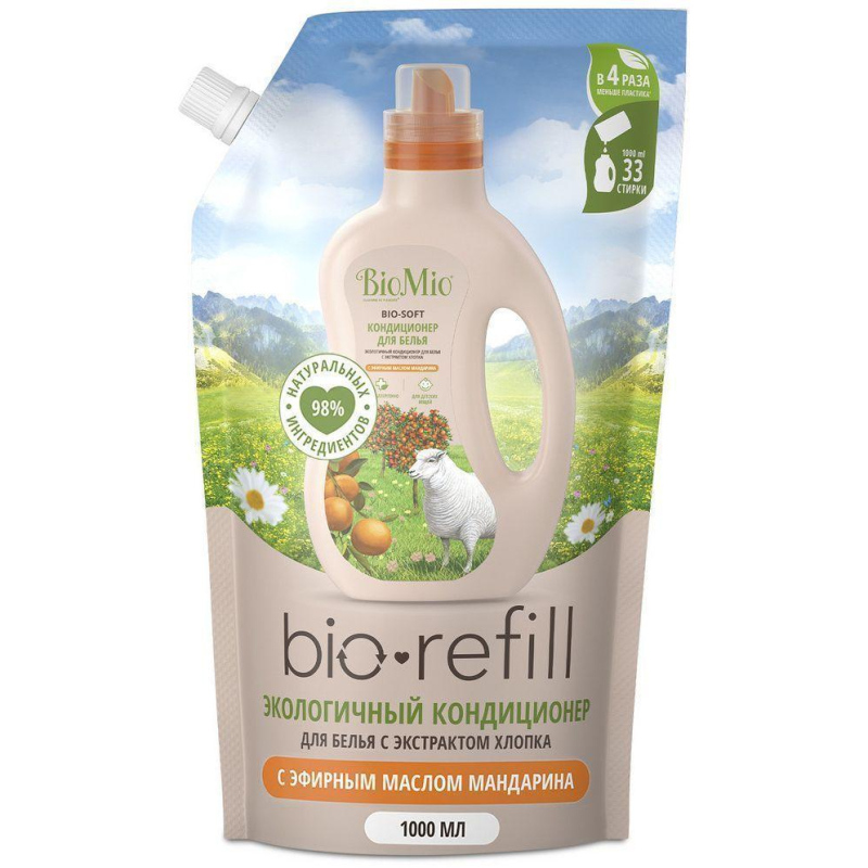 Кондиционер для белья BioMio Bio-Soft Refill Мандарин 1 л. Назначение: Экологичный гипоаллергенный кондиционер для белья в сменном блоке BioMio BIO-SOFT с эфирным маслом мандарина придает мягкость всем видам ткани, включая шелк и шерсть. Облегчает глажение. Подходит для стирки детского белья и одежды людей с чувствительной кожей. Способ применения: Перед применением флакон встряхнуть! Указанное в таблице количество средства залить в специальную ячейку стиральной машины, предназначенную для ополаскивания. При ручной стирке - полностью растворить в воде для полоскания. Не используйте больше средства, чем рекомендовано. В таком случае загрязнение воды является минимальным. Меры предосторожности: При попадании средства в глаза промыть их чистой водой, при попадании в рот - прополоскать водой. Состав: 5-15% катионные ПАВ; 5% глицерин, эфирное масло мандарина, консервант (бензиловый спирт), экстракт хлопка, лимонен. Условия хранения: от +5 °С до +25 °С. Срок годности: 24 месяца.