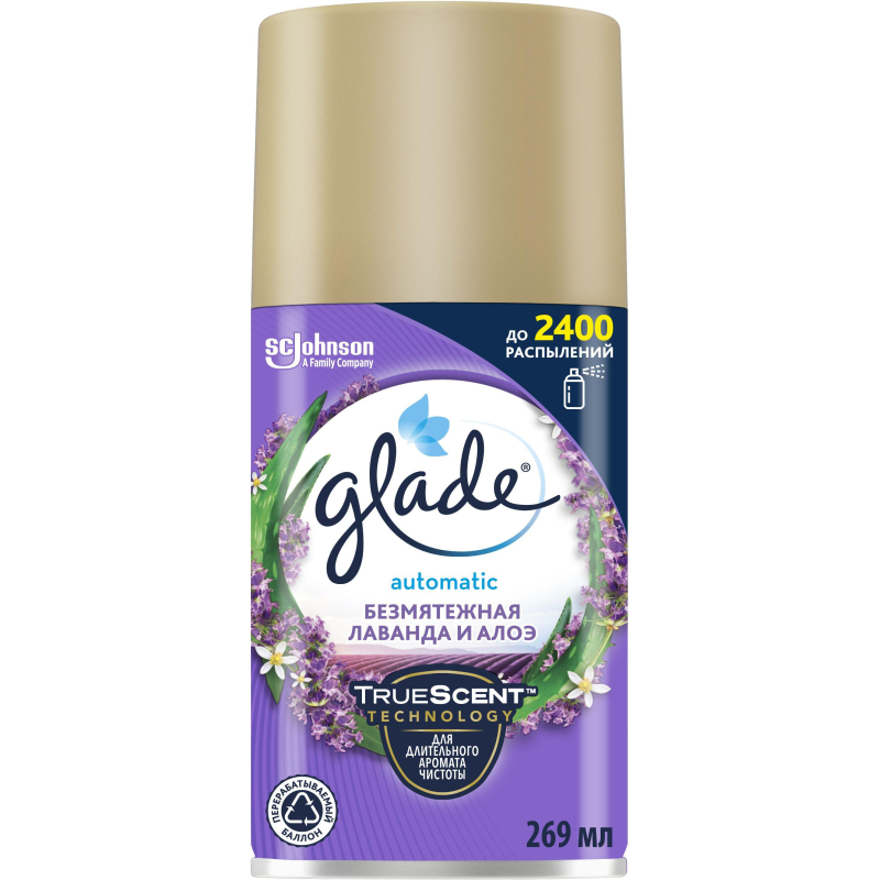 Баллон сменный для автоосвежителя Glade Automatic Лаванда и алоэ. Назначение: Погрузись в полную безмятежность. Созданный с заботой о природе, с умиротворяющими нотами прованской лаванды, алоэ и лепестков нежной фиалки, этот аромат поможет расслабиться и отдохнуть. Универсальный сменный баллон, подходит к любым автоматическим освежителям воздуха. 'True Scent Technology' гарантирует безопасность и экспертную формулу своих аэрозолей для создания ощущения чистоты. Парфюмерные композиции с эфирными маслами. Аромат 24/7, до 2400 распылений. Способ применения: Замена баллона: Держите устройство в направлении "от себя". Откройте, переведите переключатель в положение OFF и извлеките пустой баллон. Вставьте сменный баллон носиком наружу. Включите устройство, установив таймер. Первое распыление произойдет через несколько секунд. Меры предосторожности: Использовать только по назначению согласно инструкции. Не разбирать и не давать детям! Беречь от источников воспламенения, нагревания, искр, открытого огня. Не курить. Не распылять вблизи открытого огня и других источников воспламенения. Не нарушать целостности упаковки и не сжигать, даже после использования. Избегать вдыхания аэрозоля. Использовать только в хорошо проветриваемых помещениях. Не допускать попадания в глаза. Лицам с повышенной чувствительностью к ароматам применять средство с осторожностью. Использование освежителя воздуха не заменяет надлежащую гигиену. ПРИ ПОПАДАНИИ В ГЛАЗА: Осторожно промыть глаза водой в течение нескольких минут. Снять контактные линзы, если Вы ими пользуетесь и если это легко сделать. Продолжить промывание глаз. Если раздражение глаз не проходит, обратиться за медицинской помощью. Состав: > 30%: пропеллент (бутан, пропан, изобутан) денатурат, < 5% отдушка (линалоол, кумарин, бензилсалицилат, d-лимонен). Потенциальные аллергены. Не содержит озоноразрушающих хладонов. Условия хранения: Хранить в сухом, недоступном для детей и домашних животных месте при температуре от -5 до +35 градусов, отдельно от пищевых продуктов. Беречь от солнечных лучей, избегать нагревания выше 50 С. Срок годности: 2 года.