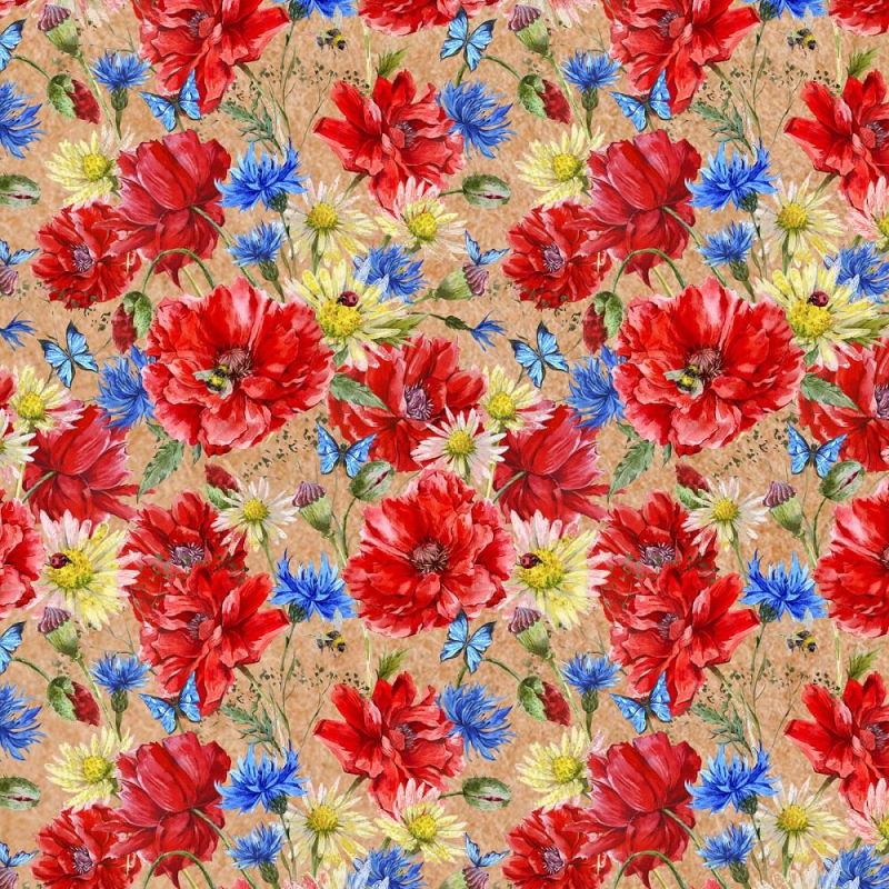 Бумага упаковочная крафт Маки ромашки, в лист100х70, немел, 80г/м2, в рул. 44728