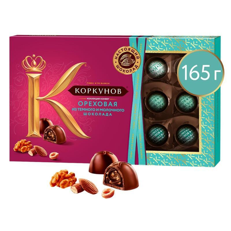 Коллекция шоколадных конфет Коркунов - изысканный и необычайно вкусный комплимент для Ваших коллег и партнеров, а также утонченный подарок для тех, кто Вам особенно важен. Удивительная и гармоничная композиция, составленная из разнообразных сочетаний настоящего шоколада, карамелизированного грецкого ореха, миндаля и фундука, а также темной ореховой начинки со вкусом кленового сиропа и апельсина. Состав: темный шоколад (какао тертое, сахар, какао масло, молочный жир, эмульгаторы (соевый лецитин, сорбитан тристеарат), ароматизатор (ванилин)); молочный шоколад (сахар, сухое цельное молоко, какао масло, какао тертое, молочный жир, эмульгаторы (соевый лецитин, сорбитан тристеарат), ароматизатор (ванилин)); сахар, жир специального назначения (масло пальмовое, масло пальмоядровое, эмульгатор (подсолнечный лецитин)), фундук, сухое цельное молоко, глюкоза, грецкий орех карамелизированный (грецкий орех, сахар, инвертный сахарный сироп), миндаль карамелизированный (миндаль, сахар, инвертный сахарный сироп), фундук карамелизированный (фундук, сахар, инвертный сахарный сироп), какао порошок, молочный жир, эмульгатор (соевый лецитин), ароматизаторы (ванилин, кленовый сироп и грецкий орех, апельсин и миндаль, фундук и мед). Конфеты содержат глютен. Могут содержать незначительное количество яичного белка, орехов (бразильский, кешью, макадамия, пекан, фисташка). Пищевая ценность: белки - 6.6 г; жиры - 35.2 г; углеводы -49.7 г; Энергетическая ценность: 552 ккал Срок годности: 8 месяцев Условия хранения: хранить при температуре от 5 до 22 °c, при относительной влажности воздуха не более 70%. Производитель: Коркунов Страна производства: Россия.
