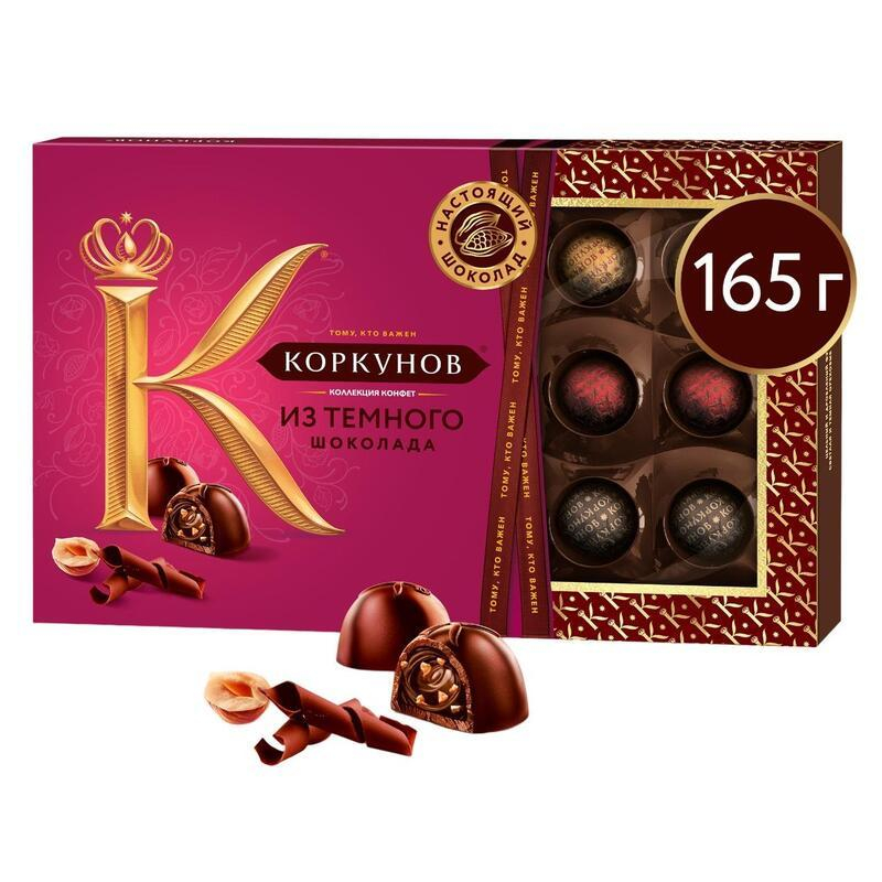 Коллекция шоколадных конфет Коркунов - изысканный и необычайно вкусный комплимент для Ваших коллег и партнеров, а также утонченный подарок для тех, кто Вам особенно важен. Удивительная и гармоничная композиция, составленная из разнообразных сочетаний настоящего темного и молочного шоколада, цельного и дробленого фундука, ореховой начинки и вафельной крошки. Выберите лишь повод, а подарок все скажет за Вас. Состав: Конфеты из темного шоколада, с цельным фундуком и темной ореховой начинкой. Состав: темный шоколад: какао тертое, сахар, какао масло, молочный жир, эмульгаторы (соевый лецитин, Е492), ароматизатор (ванилин); начинка: фундук, сахар, жир специального назначения (масло пальмовое, масло пальмоядровое, эмульгатор (подсолнечный лецитин)), сухое цельное молоко, какао порошок, глюкоза, молочный жир, эмульгатор (соевый лецитин), ароматизатор (ванилин, лесной орех). Конфеты из темного шоколада, с дробленым фундуком и светлой ореховой начинкой. Состав: темный шоколад: какао тертое, сахар, какао масло, молочный жир, эмульгаторы (соевый лецитин, Е492), ароматизатор (ванилин); начинка: сахар, фундук, жир специального назначения (масло пальмовое, масло пальмоядровое, эмульгатор (подсолнечный лецитин)), сухое цельное молоко, глюкоза, молочный жир, какао порошок, эмульгатор (соевый лецитин), ароматизатор (ванилин, лесной орех). Конфеты из темного шоколада, с темной ореховой начинкой и дробленой вафлей. Состав: темный шоколад: какао тертое, сахар, какао масло, молочный жир, эмульгаторы (соевый лецитин, Е492), ароматизатор (ванилин); начинка: сахар, жир специального назначения (масло пальмовое, масло пальмоядровое, эмульгатор (подсолнечный лецитин)), дробленая вафляx, фундук перетертый, сухое цельное молоко, какао порошок, глюкоза, молочный жир, эмульгатор (соевый лецитин), ароматизатор (ванилин). Содержат глютен. Пищевая ценность: белки - 7 г; жиры - 36.6 г; углеводы -50 г; Энергетическая ценность: 554 ккал Срок годности: 8 месяцев Условия хранения: хранить при температуре от 5 до 22 °c, при относительной влажности воздуха не более 70%. Производитель: Коркунов Страна производства: Россия.