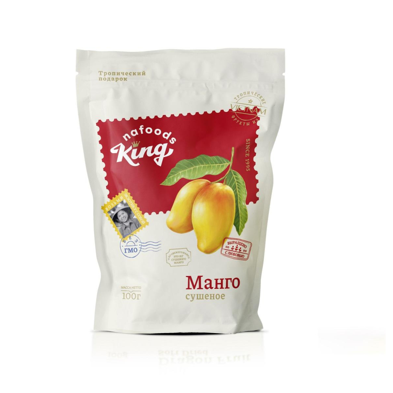 Тот самый вкус из отпуска. Насыщенное и ароматное манго - одно из главных удовольствий путешественника. Но, вернувшись с отдыха, вы понимаете, что практически невозможно найти манго такого же вкуса, какой вы пробовали в Таиланде или во Вьетнаме. Наши фермы находятся в долине реки Меконг, солоноватая вода которой обогащает фрукты полезными веществами. Урожайный и солнечный регион, заботливые руки фермеров и производство по мировым стандартам. Представьте манго, только что собранное на ферме - его вкус вне конкуренции. Наслаждайтесь им круглый год вместе с сушеным манго от KING. Мы заботимся о вашем здоровье и не используем консерванты и красители. У нас технологично организована сушка и упаковка манго, поэтому искусственные вещества просто не нужны на производстве. Современный способ тепловой сушки, упаковка Tetra Pak Group и система стерилизации UHT позволяют сохранить свойства фруктов на 12 месяцев. Нет красителям и консервантам - да натуральному вкусу спелого и сладкого плода манго! Настоящее манго в России - сушеное манго от KING, ведь именно с заботой выращиваем их на собственных фермах во Вьетнаме. KING - фрукты с ветки из долины до вашей квартиры. Убедитесь сами! Питательный и калорийный продукт содержит витамины А, группы В, С содержит антиоксиданты, ферменты и бактерии полезные для организма, помогает в работе иммунной системы.
