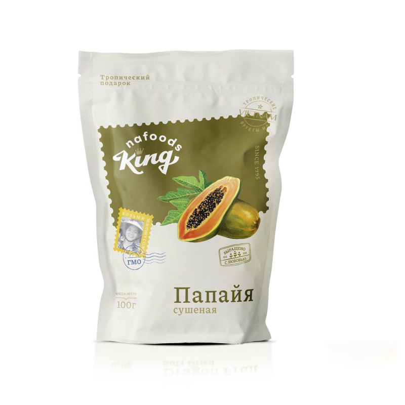 Уникальный и экзотический перекус всегда под рукой. Это тот фрукт, который, попробовав однажды, хочется еще и еще. Папайя - отличный вариант для случая, когда хочется разнообразить перекусы. Богатство витаминов и клетчатки, низкое содержание калорий и приятная сладость фрукта позволят ему органично вписаться в шорт-лист любимой еды. Вкус папайи приятно удивляет, но в то же время к нему легко привыкают даже консервативные во вкусовых предпочтениях люди. Больше всего папайя напоминает дыню с чуть более маслянистой консистенцией, а аромат чаще всего сравнивают с малиной. Несмотря на сходство во вкусе, папайя уникальна по составу. Именно в ней содержится уникальный фермент папаин, который способствует быстрому усвоению пищи. Как выбрать действительно полезную папайю? Лучший способ сохранить полезные вещества в экзотических фруктах - грамотно организовать их сушку на месте сбора. Мы, компания KING, крупнейший импортер фруктов из Вьетнама, посвятили этому более 25 лет работы. Мы выращиваем фрукты на собственных фермах, а затем применяем современную тепловую сушку и упаковываем по технологии Tetra Pak. Консерванты, красители и подсластители при этом не требуются. Папайя сохраняет вкус и свойства на протяжении 12 месяцев за счет современной упаковки.
