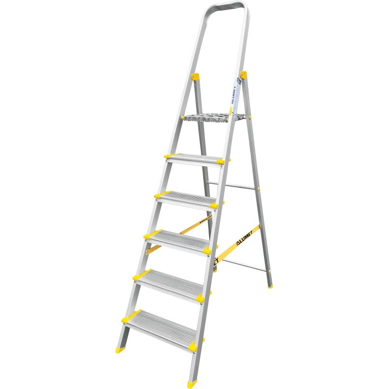 Стремянка алюминиевая 6 ступеней Алюмет (AS706). Применяется для различных работ на высоте. Конструкция из анодированного алюминия отличается высокой прочностью, небольшим весом и устойчивостью к воздействию коррозии. Широкие ступени и рабочая площадка с рифлением защищают от скольжения ноги и обеспечивают безопасность работы. Страховочные ремни надежно фиксируют стремянку на месте. Башмаки изготовлены из высокопрочного пластика. Высокая дуга безопасности служит в качестве опоры во время работы Складная конструкция не займет много места при хранении или транспортировке. Внешний вид и/или характеристики товара могут быть изменены производителем в соответствии с производственным процессом.