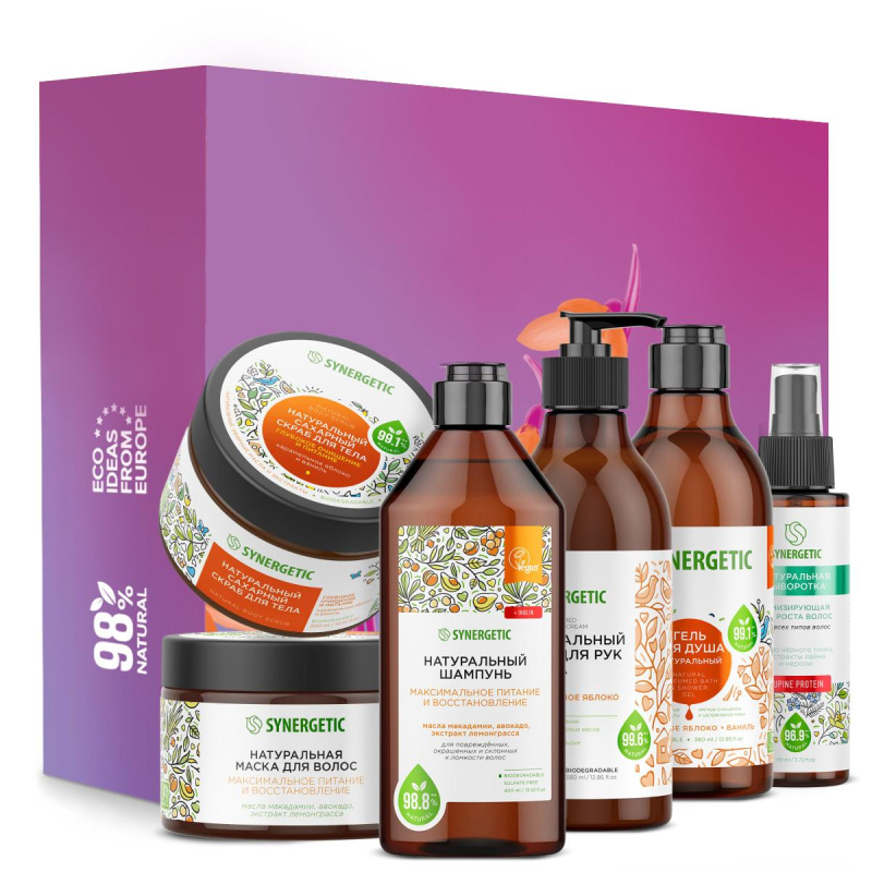 Подарочный набор для ухода за телом и волосами Synergetic SPA Beauty. В составн набора входит: Бессульфатный шампунь Synergetic "Максимальное питание и восстановление" 400 мл: эффективное средство для очищения кожи головы и поврежденных, окрашенных, склонных к ломкости волос - более чем на 98% состоит из натуральных компонентов. Шампунь деликатно очищает, эффективно ухаживает за волосами и защищает кожу головы. Благодаря входящему в состав природному инулину волосы становятся более гладкими, ухоженными и блестящими, оказывает восстанавливающее действие. Активные компоненты в составе шампуня укрепляют волосы и стимулируют восстановление кератиновых волокон. Способ применения: нанести небольшое количество шампуня на влажные волосы, хорошо вспенить и тщательно смыть водой. При необходимости повторить процедуру. Возможно появление естественного осадка натурального происхождения и незначительное изменение цвета шампуня, не влияющие на его качество и свойства. Натуральная маска для волос Synergetic "Максимальное питание и восстановление" 300 мл: комплексно воздействует на волосы и кожу головы и обеспечивает эффективный уход. Активные компоненты маски интенсивно питают и восстанавливают волосы по всей длине, делая их мягкими и шелковистыми. Масла авокадо и макадамии питают, оказывают смягчающее действие и увлажняют сухие и ломкие волосы, защищая их от внешних агрессивных воздействий. Экстракт лемонграсса усиливает питание корней и улучшает состояние тусклых и тонких волос. Комплекс масел кокоса и жожоба восстанавливает структуру волос изнутри, делая их шелковистыми и блестящими без эффекта утяжеления. Натуральные растительные эмоленты облегчают расчесывание волос и обеспечивают длительный кондиционирующий эффект. Они эффективно смягчают, делая волосы гладкими, блестящими и ухоженными. Способ применения: нанесите маску на чистые влажные волосы, равномерно распределите по всей длине и оставьте на 7-10 мин, тщательно смойте водой. Натуральный биоразлагаемый гель для душа Synergetic "Карамельное яблоко и ваниль" 380 мл: это деликатное средство для очищения кожи, на 99,1% состоящее из натуральных компонентов. Гипоаллергенный аромат геля SYNERGETIC 'Карамельное яблоко и ваниль' разработан в швейцарском доме Givaudan с использованием натуральных эфирных масел померанца, корицы и лимона. Масла бабассу и сладкого миндаля, экстракты ванили и яблока оказывают регенерирующее действие, питают и увлажняют сухую кожу, делая ее гладкой и бархатистой. Бисаболол снимает раздражение и восстанавливает барьерные функции кожи. Софоролипид из рапсового масла мягко очищает и сохраняет естественный микробиом кожи. Способ применения: нанести гель на влажную кожу, вспенить и тщательно смыть водой. Перед применением рекомендуется взболтать. Возможно выпадение естественного осадка и незначительное изменение цвета геля, не влияющие на его качество и свойства. Натуральный сахарный скраб для тела Synergetic глубокое очищение и питание, карамельное яблоко и ваниль 300 мл: это эффективное средство для ухода за кожей, более чем на 99% состоящее из натуральных компонентов. Скраб деликатно отшелушивает и глубоко очищает кожу, делая ее гладкой и бархатистой. Масло карите, экстракты ванили и яблока оказывают регенерирующее действие, питают и увлажняют кожу, а бисаболол успокаивает и восс
