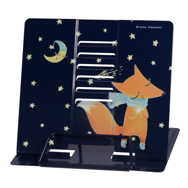Металлическая подставка "Волшебный лис" с регулировкой наклона и прижимным механизмом для страниц от Bruno Visconti. Несколько ступеней спинки позволяют использовать ее в соответствии с индивидуальными предпочтениями и привычками и читать книгу под разным уровнем наклона. Подставка легкая, прочная и компактная - не займет много места в школьном рюкзаке. В ее основании есть резиновые стопоры, которые уберегут подставку от скольжения, а стол - от царапин. Яркий и позитивный дизайн не оставит никого равнодушным.