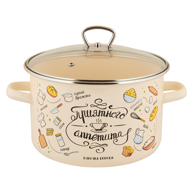 Кастрюля Appetite Приятного аппетита 5.5 л эмалированная сталь с крышкой Серия посуды "Приятного аппетита" кастрюля 5,5 л - это небольшая книга рецептов, призванная дарить вдохновение и ежедневно помогать на кухне. Каждое изделие уникально, на разных предметах серии можно найти свой рисунок, рецепт или наводку на него. У каждой хозяйки свой борщ, у каждого хозяина свой рецепт мяса, и потрясающее разнообразие блюд - это то прекрасное, чему мы можем радоваться каждый день. Посуда очень экологична, не вступает в реакцию с пищевыми кислотами и щелочами, тем самым сохраняется вкус пищи, в нее не попадают вредные для здоровья человека соединения. В кастрюле можно не только готовить, но и безопасно хранить пищу. Кастрюля также подходит для заготовок и маринования, для шашлыков, для супов, для квашения - это универсальная посуда на кухне! Кастрюля с крышкой отличается высоким качеством, гладкая непористая поверхность посуды обеспечивает простой и легкий уход. Изделие подходит для всех видов плит: индукционных, газовых, электрических, стеклокерамических. Можно мыть в посудомоечной машине. Объем: 5,5 л. Диаметр: 18 см. Высота: 14,8 см. Вес: 1,4 кг.