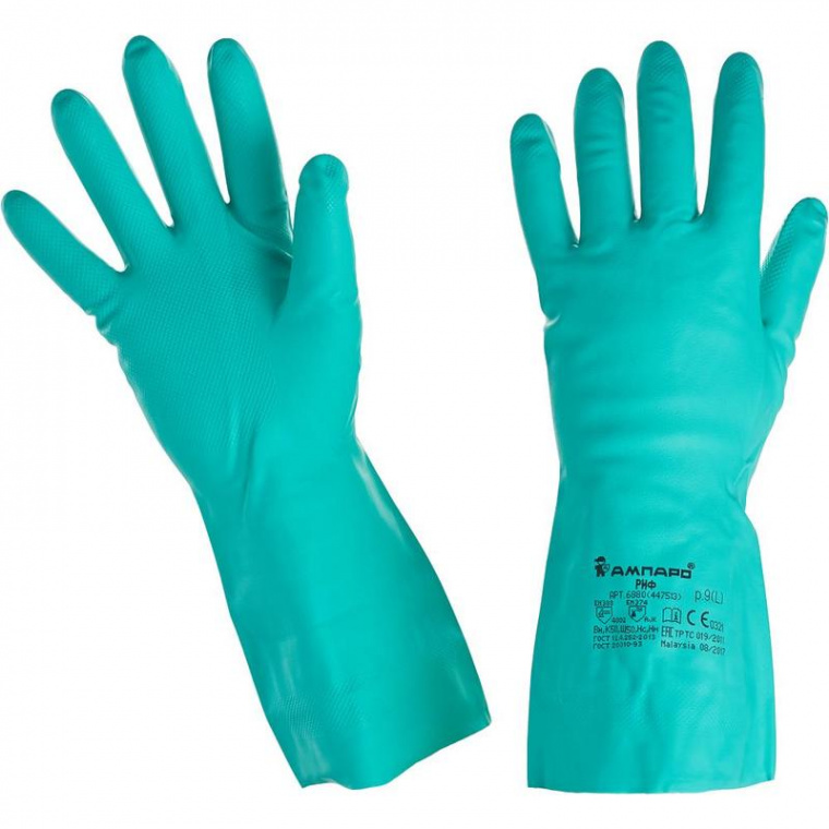 Перчатки химостойкие устойчивые к широкому диапазону химикатов, растворов кислот (до 80%), щелочей (до 50%), спиртов, нефти и бензина. Перчатки удлинённые, с рифлением на ладонной части и внутренним х/б напылением. Обеспечивают хорошую чувствительность рук. Рекомендованы для покрасочных работ, сортировки мелких предметов, сборочных работ, в химической промышленности. Материал: нитрил с внутренним х/б напылением. Толщина 0,4 мм. Длина 33 см. Размер: L(9). Цвет: зелёный. Упаковка: Каждая пара имеет собственную упаковку. Срок хранения: 4.5 года.