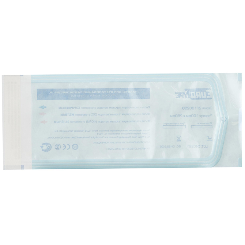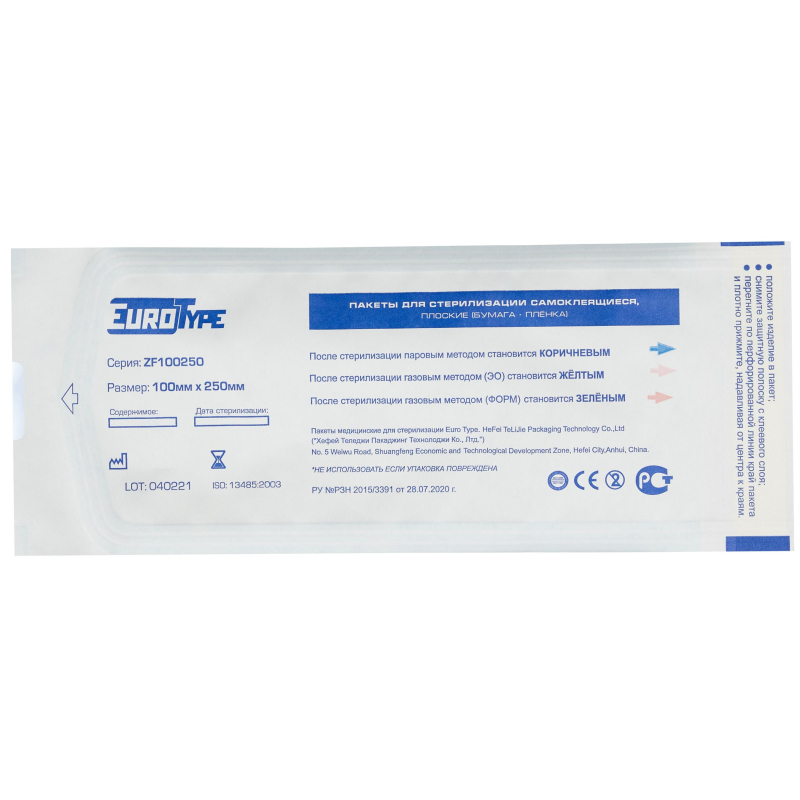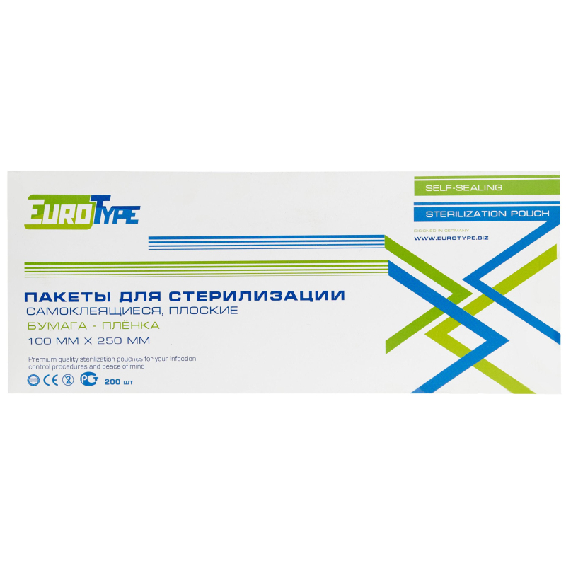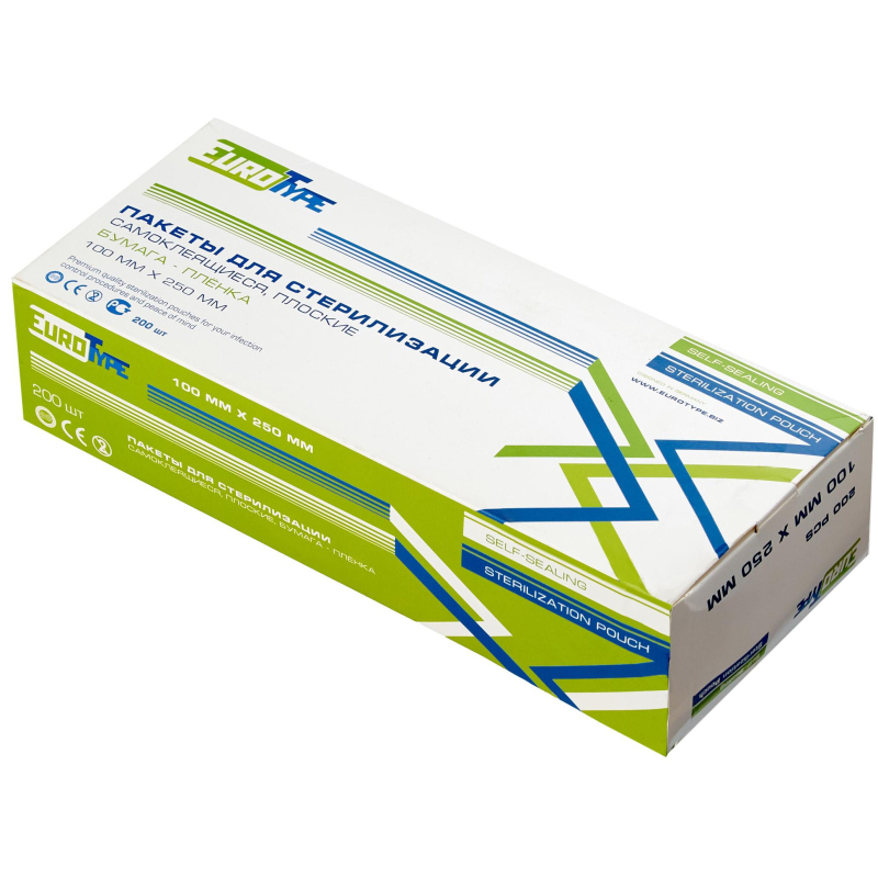 Пакет для стерилизации комбинированный EuroType для паровой/газовой стерилизации 100 x 250 мм самоклеящийся (200 штук в упаковке). Самоклеящиеся пакеты изготовлены из: -непрозрачная сторона - медицинская бумага (60g/m2), на эту сторону наносится маркировка; -прозрачная сторона - прозрачная полимерная пленка (полиэстер = 12um + полипропилен=40um). Прозрачная и непрозрачная стороны соединены между собой термошвами. Уголки пакетов дополнительно запаяны для предотвращения скопления в них пыли. Прозрачная сторона позволяет легко идентифицировать упакованные изделия. С открытого конца самоклеящихся пакетов, на внутренней поверхности выступающей бумажной части, нанесен слой термостойкого клея, закрытый защитной бумажной полоской. На противоположном (запаянном) конце пакета имеется вырез для пальца, облегчающий открывание упаковок при извлечении из них простерилизованных изделий. На бумажной стороне пакетов и рулонного материала нанесены обозначения: -торговая марка; -маркировка типоразмера; -цветные химические индикаторы в виде двух фигурных стрелок, под которыми написано название соответствующего стерилизующего агента с описанием цвета, приобретаемого индикатором после стерилизации. Для парового метода - индикатор голубого цвета, после стерилизации приобретает коричневый цвет; для газового метода с применением окиси этилена - индикатор розового цвета, после стерилизации приобретает желтый цвет; для газового метода с применением формальдегида - индикатор желтого цвета, после стерилизации приобретает зеленый цвет; -схематическое изображение и письменное указание места вскрытия упаковки; -предостережение "не использовать, если упаковка повреждена", "хранить в прохладном сухом месте"; -место для проставления даты стерилизации -обозначение: "одноразовое изделие". Кроме того, на внешней стороне выступающей бумажной части самоклеящихся пакетов напечатан порядок действий при закрывании пакета: -вложить изделие в пакет; -снять защитную полоску с адгезивного (клеевого) слоя; -перегнуть бумажный конец по линии перфорации и плотно надавить в направлении от центра к боковым термошвам.