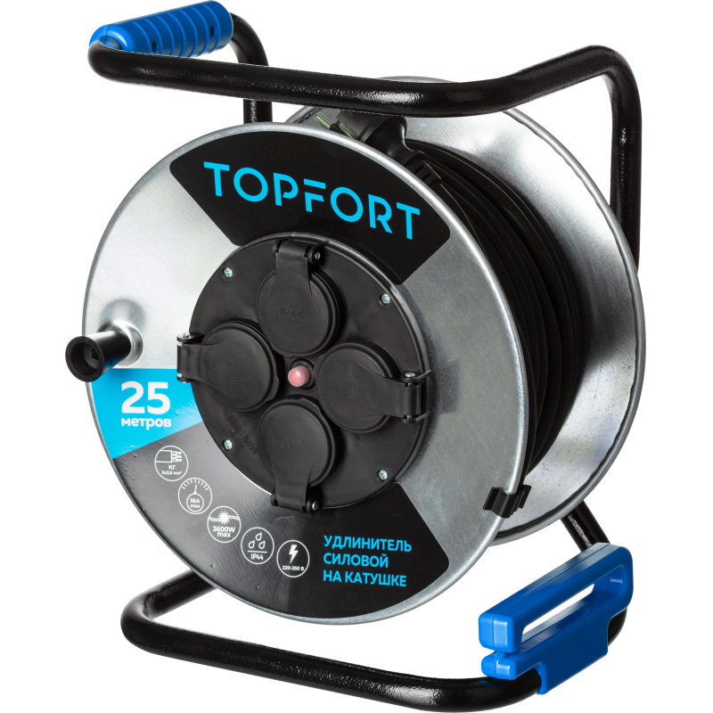 Силовой удлинитель на металлической катушке TOPFORT оснащен 4-мя розетками. Предназначен для подключения электрооборудования к сети. Подойдет для использования на даче, на строительной площадке, в производственных цехах и пр. Удобен при работе с приборами, находящимися удаленно от стационарной розетки: газонокосилки, снегоочистители, электрические пилы, триммеры, электрические газонокосилки, моечные машины или электродрели. Данный удлинитель можно использовать на открытом воздухе. Безопасность удлинителя обеспечивается за счет наличия термовыключателя, не позволяющего использовать изделие с превышением заявленных характеристик. Преимущества изделия: - Каркас и корпус катушки изготовлен из оцинкованной стали - Розетки снабжены влагозащищенными защитными крышками по стандарту IP 44 - Провод КГ устойчив к механическим повреждениям - Удобное сматывание провода без спутывания достигается использованием в конструкции специального укладчика - Удобно хранить и транспортировать, благодаря компактным размерам Характеристики изделия: - Длина провода 25 м - Максимальная мощность 3600 Вт - Максимальный ток 16А - Температурный диапазон эксплуатации: от -20 до 30 градусов - Вес: 6 кг Внешний вид и/или характеристики товара могут быть изменены производителем в соответствии с производственным процессом.