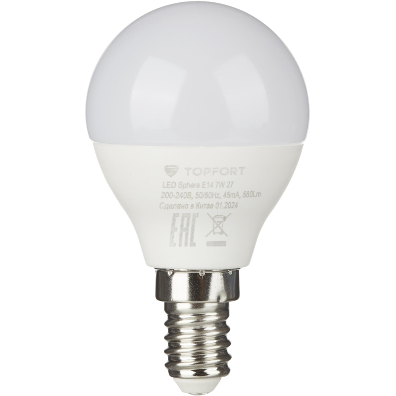 Светодиодная лампа Topfort (матовая) формы шар, с цоколем Е14, мощность 7В. Является аналогом лампы накаливания в 60 Ватт. Матированное покрытие колбы позволяет рассеивать свет максимально приятно для восприятия глазом человека. Преимущества изделия: - Срок службы 25 000 часов - Диапазон рабочих температур от - 25 до +50°C - Отличается низким энергопотребление, что существенно снизит счета за оплату электроэнергии - Создает равномерное естественное освещение - Экологически и пожаробезопасна, не содержит ртути и других вредных химических веществ; - Не требует специальной утилизации; - Отсутствуют низкочастотные пульсации светового потока, негативно влияющих на зрение Характеристики изделий: - Коэффициент цветопередачи Ra ? 80 - Световой поток 560 Лм - Цветовая температура 2700 К - Угол светового пучка 240° Основные габариты (мм): - Длина 84 мм (L) - Диаметр 45 мм (D) Области применения: - Бытовое использование: потолочные, настенные, настольные светильники, люстры и бра - Коммерческое освещение: мебельные салоны, салоны красоты, столовые, кафе, рестораны, фитнес-центры и т. д. Внешний вид и/или характеристики товара могут быть изменены производителем в соответствии с производственным процессом.