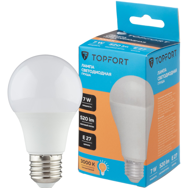 Светодиодная лампа Topfort (матовая) формы груша, с цоколем Е27, мощность 7В. Является аналогом лампы накаливания в 60 Ватт. Матированное покрытие колбы позволяет рассеивать свет максимально приятно для восприятия глазом человека. Преимущества изделия: - Срок службы 25 000 часов - Диапазон рабочих температур от - 25 до +50°C - Отличается низким энергопотребление, что существенно снизит счета за оплату электроэнергии - Создает равномерное естественное освещение - Экологически и пожаробезопасна, не содержит ртути и других вредных химических веществ; - Не требует специальной утилизации; - Отсутствуют низкочастотные пульсации светового потока, негативно влияющих на зрение Характеристики изделий: - Коэффициент цветопередачи Ra ? 80 - Световой поток 520 Лм - Цветовая температура 3000 К - Угол светового пучка 240° Основные габариты (мм): - Длина 108 мм (L) - Диаметр 60 мм (D) Области применения: - Бытовое использование: потолочные, настенные, настольные светильники, люстры и бра - Коммерческое освещение: мебельные салоны, салоны красоты, столовые, кафе, рестораны, фитнес-центры и т. д. Внешний вид и/или характеристики товара могут быть изменены производителем в соответствии с производственным процессом.