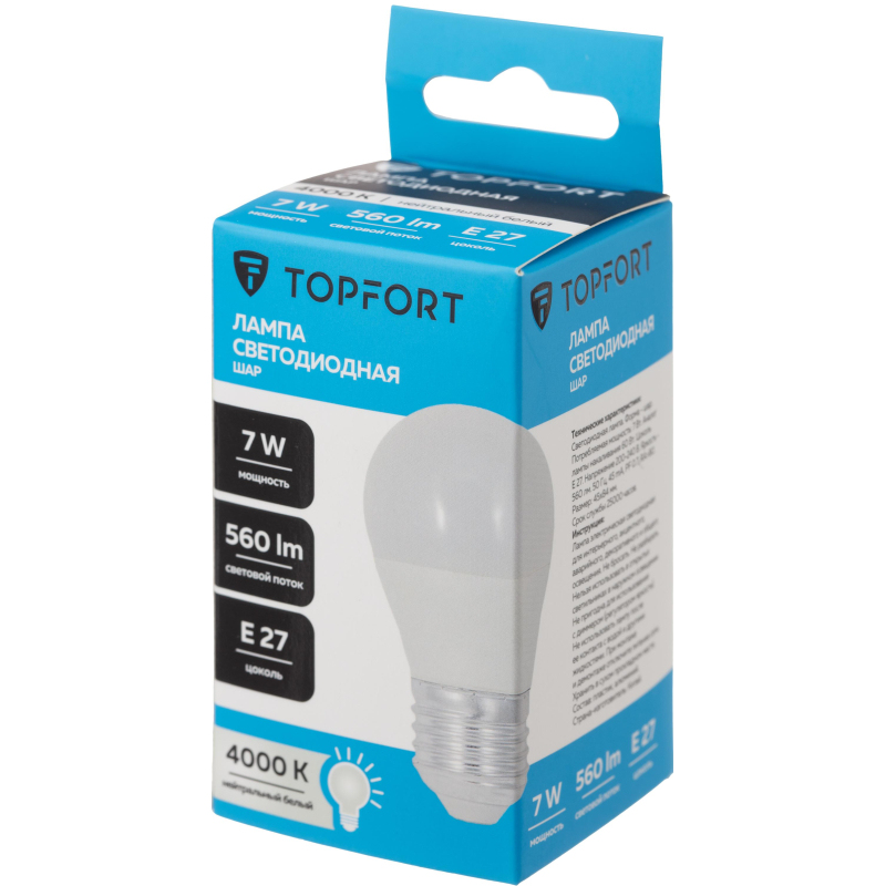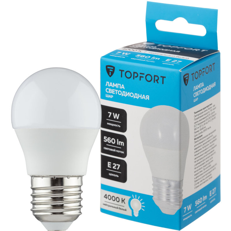 Светодиодная лампа Topfort (матовая) формы шар, с цоколем Е27, мощность 7В. Является аналогом лампы накаливания в 60 Ватт. Матированное покрытие колбы позволяет рассеивать свет максимально приятно для восприятия глазом человека. Преимущества изделия: - Срок службы 25 000 часов - Диапазон рабочих температур от - 25 до +50°C - Отличается низким энергопотребление, что существенно снизит счета за оплату электроэнергии - Создает равномерное естественное освещение - Экологически и пожаробезопасна, не содержит ртути и других вредных химических веществ; - Не требует специальной утилизации; - Отсутствуют низкочастотные пульсации светового потока, негативно влияющих на зрение Характеристики изделий: - Коэффициент цветопередачи Ra ? 80 - Световой поток 560 Лм - Цветовая температура 4000 К - Угол светового пучка 240° Основные габариты (мм): - Длина 84 мм (L) - Диаметр 45 мм (D) Области применения: - Бытовое использование: потолочные, настенные, настольные светильники, люстры и бра - Коммерческое освещение: мебельные салоны, салоны красоты, столовые, кафе, рестораны, фитнес-центры и т. д. Внешний вид и/или характеристики товара могут быть изменены производителем в соответствии с производственным процессом.