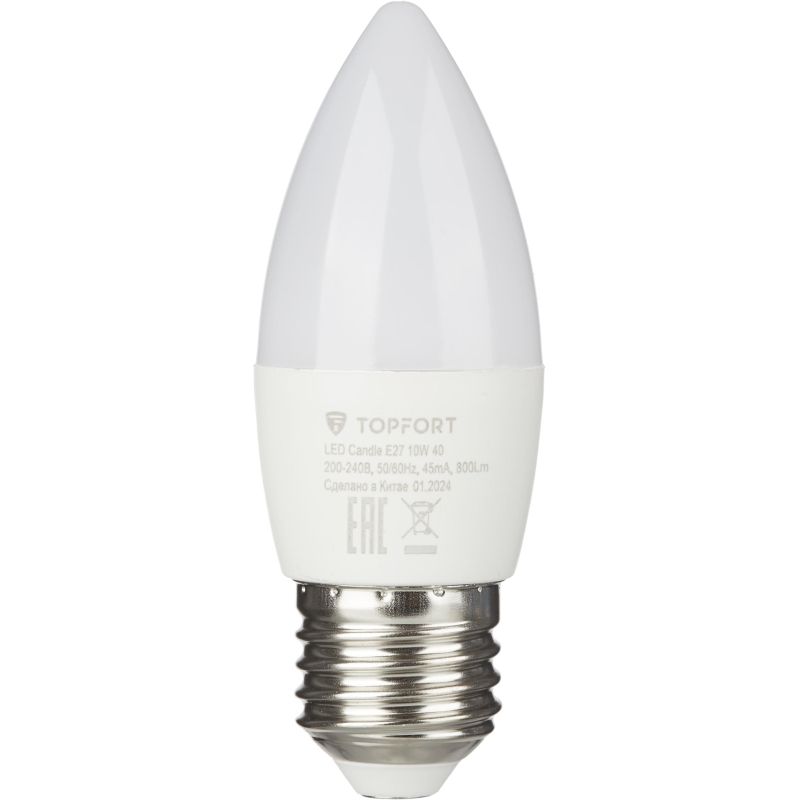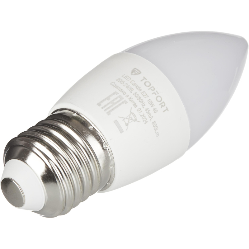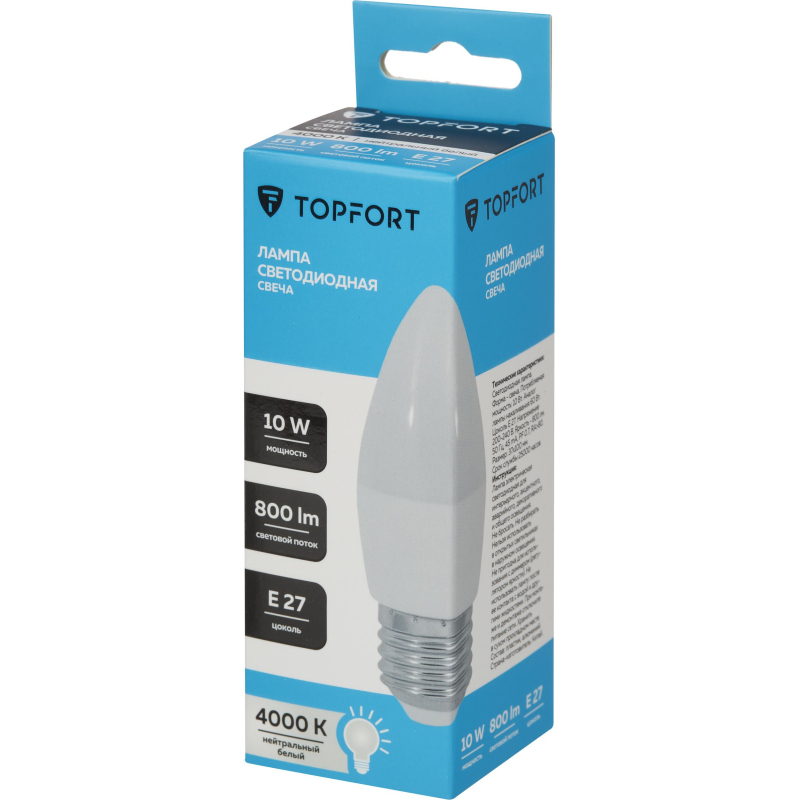 Светодиодная лампа Topfort (матовая) формы свеча, с цоколем Е27, мощность 10 В. Является аналогом лампы накаливания в 60 Ватт. Матированное покрытие колбы позволяет рассеивать свет максимально приятно для восприятия глазом человека. Преимущества изделия: - Срок службы 25 000 часов - Диапазон рабочих температур от - 25 до +50°C - Отличается низким энергопотребление, что существенно снизит счета за оплату электроэнергии - Создает равномерное естественное освещение - Экологически и пожаробезопасна, не содержит ртути и других вредных химических веществ; - Не требует специальной утилизации; - Отсутствуют низкочастотные пульсации светового потока, негативно влияющих на зрение Характеристики изделий: - Коэффициент цветопередачи Ra ? 80 - Световой поток 800 Лм - Цветовая температура 4000 К - Угол светового пучка 240° Основные габариты (мм): - Длина 100 мм (L) - Диаметр 37 мм (D) Области применения: - Бытовое использование: потолочные, настенные, настольные светильники, люстры и бра - Коммерческое освещение: мебельные салоны, салоны красоты, столовые, кафе, рестораны, фитнес-центры и т. д.