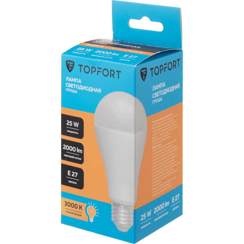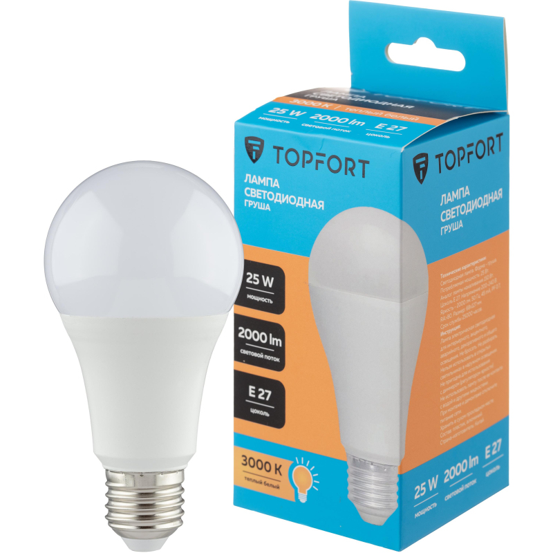 Светодиодная лампа Topfort (матовая) формы груша, с цоколем Е27, мощность 25В. Является аналогом лампы накаливания в 150 Ватт. Матированное покрытие колбы позволяет рассеивать свет максимально приятно для восприятия глазом человека. Преимущества изделия: - Срок службы 25 000 часов - Диапазон рабочих температур от - 25 до +50°C - Отличается низким энергопотребление, что существенно снизит счета за оплату электроэнергии - Создает равномерное естественное освещение - Экологически и пожаробезопасна, не содержит ртути и других вредных химических веществ; - Не требует специальной утилизации; - Отсутствуют низкочастотные пульсации светового потока, негативно влияющих на зрение Характеристики изделий: - Коэффициент цветопередачи Ra ? 80 - Световой поток 2000 Лм - Цветовая температура 3000 К - Угол светового пучка 240° Основные габариты (мм): - Длина 127 мм (L) - Диаметр 68 мм (D) Области применения: - Бытовое использование: потолочные, настенные, настольные светильники, люстры и бра - Коммерческое освещение: мебельные салоны, салоны красоты, столовые, кафе, рестораны, фитнес-центры и т. д. Внешний вид и/или характеристики товара могут быть изменены производителем в соответствии с производственным процессом.