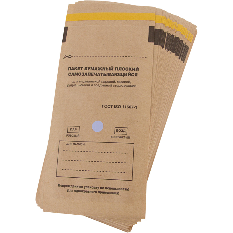 Пакет для стерилизации Террамед 100 x 200 мм самоклеящийся (100 штук в упаковке). Пакет бумажный для медицинской паровой, газовой, радиационной и воздушной стерилизации. На лицевой стороне пакета нанесен индикатор воздушной и паровой стерилизации Класс 1 по ГОСТ ISO 11140-1 в виде стикера. На выступающий клапан пакета нанесена полоска клеевого слоя, защищенная антиадгезивной материалом, предотвращающей высыхание клея. Пакет предназначен для стерилизации воздушным (до 200°С) и паровым методами (до 134°С). Пакеты предназначены для однократного применения. Пакеты соответствуют требованиям технических условий производителя (ТУ 32.50.50-002-01432322-2019) и требованиям ГОСТ ISO 11607-2011. Срок сохранения стерильности ИМН в пакете после стерилизации 3 года. Размер пакета: 100 мм х 200 мм. В индивидуальной расфасовке по 100 пакетов. Срок годности пакетов с момента их изготовления составляет 60 месяцев.