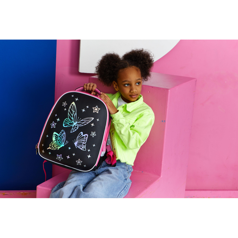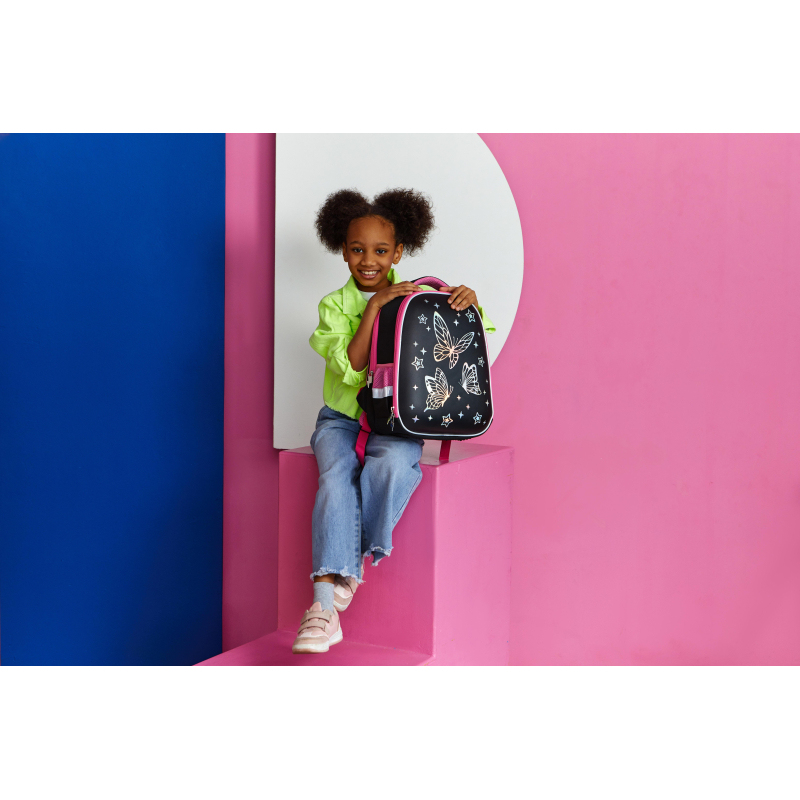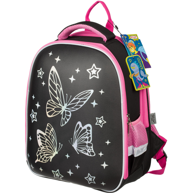 Школьный ранец Gloss Галографик Баттерфляй с дизайном для девочек младших классов. Ранец имеет обтекаемую эргономичную форму и жесткий каркас. Удобен за счет анатомической спинки из дышащего материала. Ранец выполнен из полиэстера. Имеет два вместительных отделения на молнии. Ранец оснащен двумя ручками: одна узкая, чтобы вешать на парту, вторая широкая и мягкая, чтобы удобно носить в руке. Широкие удобные лямки из воздухообменного сетчатого материала регулируются по длине и по спинке ранца - удобно подогнать под рост ребенка, что позволяет добиться наиболее комфортного расположения ранца на спине. Благодаря устойчивому плотному дну, которое держит форму, ранцем удобно пользоваться и ставить около парты, ранец не падает. Ранец имеет 2 боковых кармана-сеточки для бутылки и прочих аксессуаров. Для безопасности ребенка в темное время суток предусмотрены светоотражатели на передней части ранца, на лямках и под боковыми карманами. Размер: 350x255x135 мм. Базовый цвет: черный. Объем: 12 л. Вес: 0.760 кг. Дизайн: Бабочки.