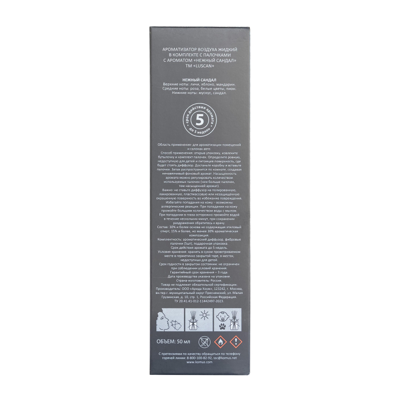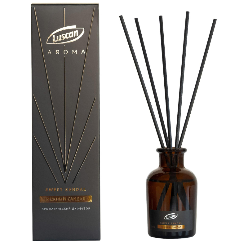 Аромадиффузор Luscan Нежный сандал 50 мл. Одной из важных составляющих уюта в доме считается аромат. Аромадиффузор с палочками Luscan Нежный сандал - это самый простой, изящный, эффективный и долговременный способ ароматизации пространства, набирающий свою популярность во всем мире день ото дня. Диффузор представляет их себя небольшую бутылочку, в которую вставляются специальные палочки. Насыщаясь жидкостью в бутылочке, они начинают распространять приятный аромат.Ноты аромата: верхние ноты: личи, яблоко, мандарин; средние ноты: роза, белые цветы, пион; нижние ноты: мускус, сандал.Состав: 30% и более основа, не содержащая этиловый спирт; 15% и более, но не менее 30% ароматическая композиция. Объем: 50 мл.Упаковка: картонная коробка и термоусадочная пленка.Срок действия: до 5 недель. Срок годности в закрытом состоянии: неограничен. Страна изготовитель: Россия.Способ применения: открыв упаковку, извлеките бутылочку и комплект палочек. Определите ровную, недоступную для детей и питомцев поверхность, где будет стоять диффузор. Достаньте бутылочку и вставьте палочки. Запах распространится по комнате, создавая ненавязчивый фоновый аромат. Насыщенность аромата можно регулировать количеством используемых палочек (чем больше палочек, тем насыщенней аромат).