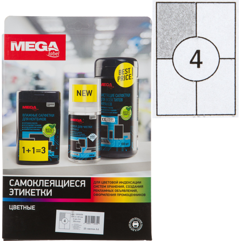 Этикетки самоклеящиеся Promega label 105х148мм желтая 4ш/л А4 25л/уп