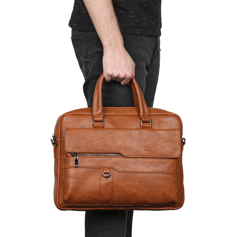 Сумка для документов Polar из экокожи коричневого цвета (98515) имеет одно основное отделение, которое закрывается на металлическую молнию. Внутри есть отделение для электронных устройств или ноутбука с диагональю до 15 и открытый кармашек. Модель вмещает формат A4. На передней и задней стенке сумки есть отделения, которые закрываются на магнитные кнопки и карманы на молнии. Высота ручек 10 см, в комплекте есть регулируемый наплечный ремень, максимальная длина 145 см.