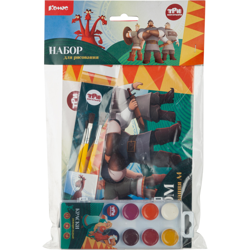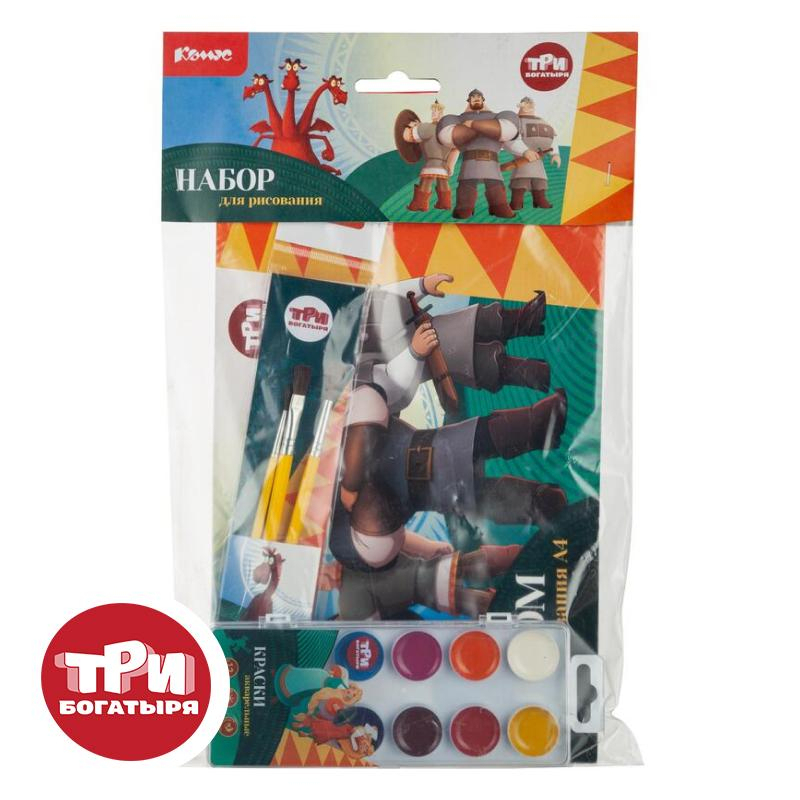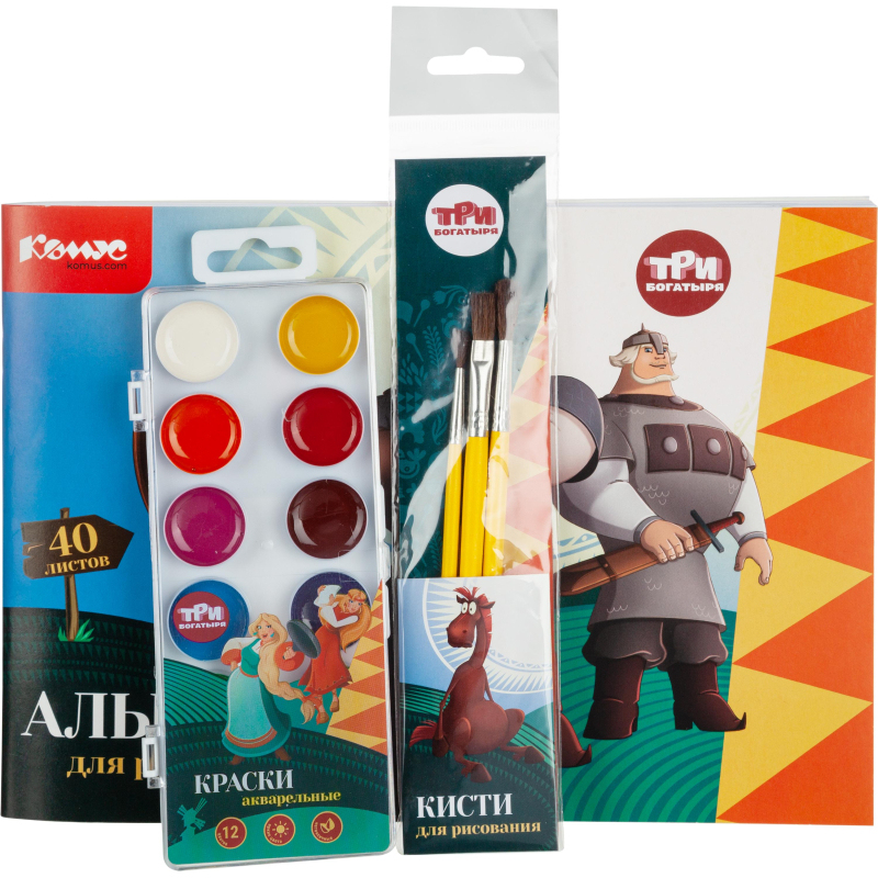 Набор школьный для рисования Комус Три Богатыря 5 предметов упакован в пакет ZIP-Lock, сверху оснащен картонным европодвесом с фигурным вырезом для возможности дальнейшего подвешивания на крючки и направляющие, установленные на торговых стендах и в прикассовой зоне. Включает ассортимент для реализации творческого воображения школьника. При этом дизайн всего ассортимента в составе набора представлен героями мультфильма "Три богатыря". Школьный набор включает 5 предметов: Альбом для рисования - 1 штука. Кисти для рисования - 3 штуки. Набор акварельных красок - 1 штука. Наполнение набора может меняться на соответствующее по составу и стоимости в зависимости от наличия товара на складе.