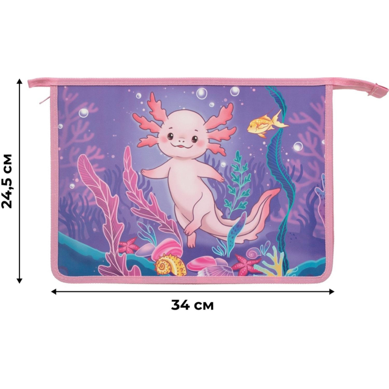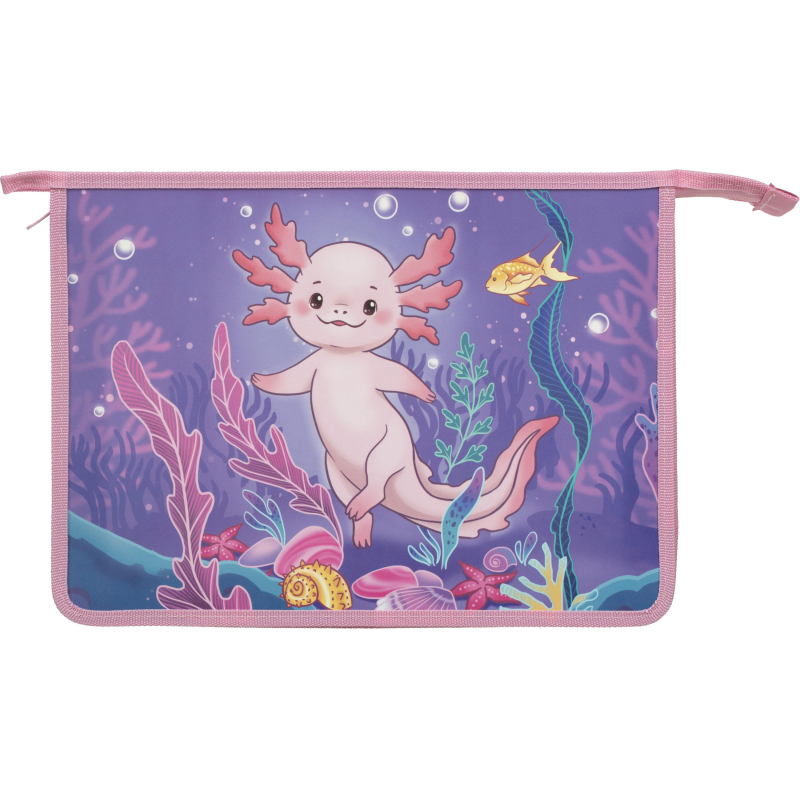 Папка для тетрадей Комус Класс Аксолотль - пластиковая емкость формата А4 для хранения и транспортировки бумажной продукции. Имеет одно отделение (без вкладыша), которое закрывается на обычной молнии. Папка фиолетового цвета с изображением аксолотли выполнена в дизайне для девочек. Материал папки надежно защищает содержимое от внешнего воздействия, а сама емкость не занимает много места и легко помещается в портфель.