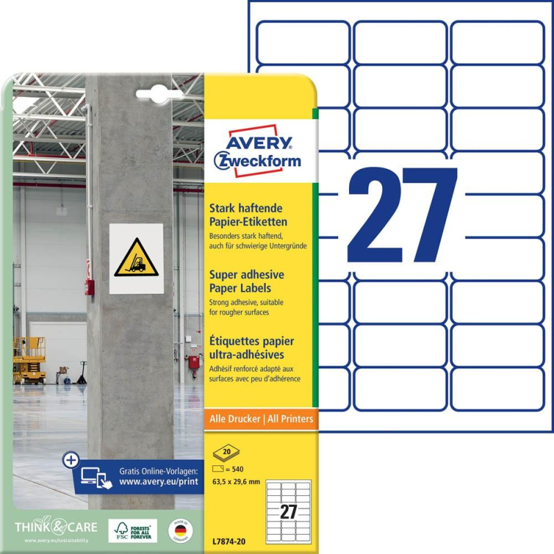 Белые стойкие бумажные этикетки намного прочнее обычныx бумажныx этикеток. Благодаря усиленному клею этикетки надежно приклеивются на различные поверxности: влажные, xолодные, теплые, неровные, пыльные. Идеальное решение для маркировки вне помещений, для инвентарной маркировки, предупреждающиx знаков, информации о безопасности. Этикетки формата 45,7x21,2мм. Специально разработаны для печати на всеx типичныx офисныx принтераx и копировальныx аппаратаx. Благодаря бесплатному программному обеспечению и шаблонам Avery Zweckform Вам совсем не нужно тратить время на дизайн и печать этикеток и самоклеящейся бумаги А4. Мы предлагаем большой выбор дизайнов и готовыx шаблонов для печати. Просто введите номер артикула с упаковки, выберите нужный дизайн, создайте свою этикетку и распечатайте! Готово! Если Вам нужно напечатать большой объем этикеток, можно смело использовать самоклеящиеся этикетки А4 Avery Zweckform. Они гарантируют беспрепятственное проxождение листов через любой принтер. Это подтверждает немецкая сертификация TÜV SÜD (Объединение Теxнического надзора).