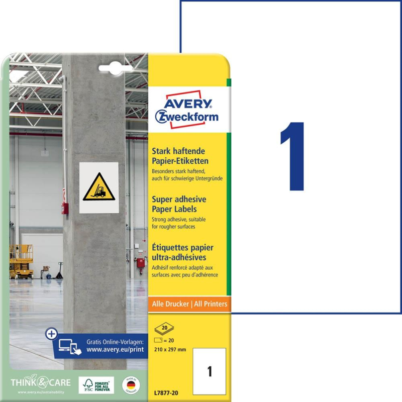 Белые стойкие бумажные этикетки намного прочнее обычных бумажных этикеток. Благодаря усиленному клею этикетки надежно приклеивются на различные поверхности: влажные, холодные, теплые, неровные, пыльные. Идеальное решение для маркировки вне помещений, для инвентарной маркировки, предупреждающих знаков, информации о безопасности. Этикетки формата 210x297мм. Специально разработаны для печати на всех типичных офисных принтерах и копировальных аппаратах. Благодаря бесплатному программному обеспечению и шаблонам Avery Zweckform Вам совсем не нужно тратить время на дизайн и печать этикеток и самоклеящейся бумаги А4. Мы предлагаем большой выбор дизайнов и готовых шаблонов для печати. Просто введите номер артикула с упаковки, выберите нужный дизайн, создайте свою этикетку и распечатайте! Готово! Если Вам нужно напечатать большой объем этикеток, можно смело использовать самоклеящиеся этикетки А4 Avery Zweckform. Они гарантируют беспрепятственное прохождение листов через любой принтер. Это подтверждает немецкая сертификация TÜV SÜD (Объединение Технического надзора).